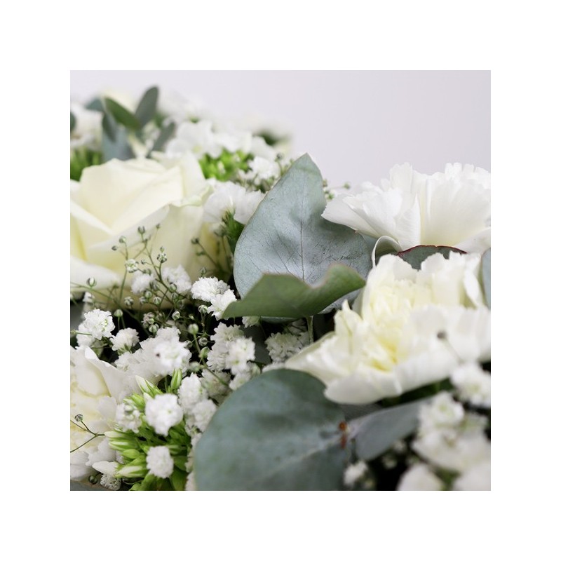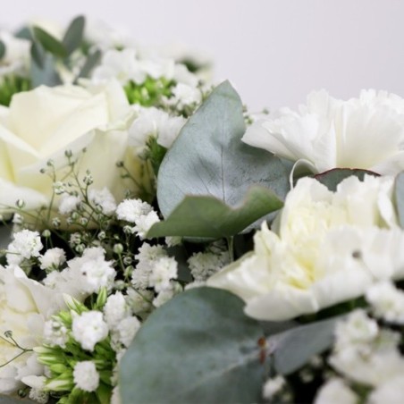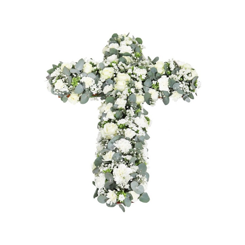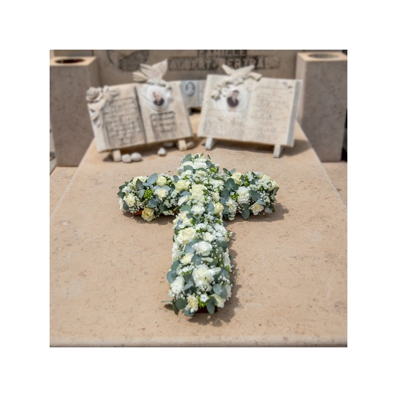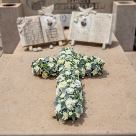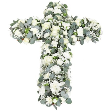 Croix de deuil dans les tons blancs composée d'oeillets, roses, fleurettes et feuillages.