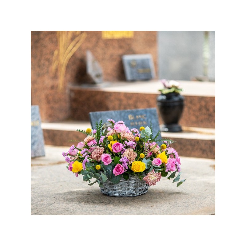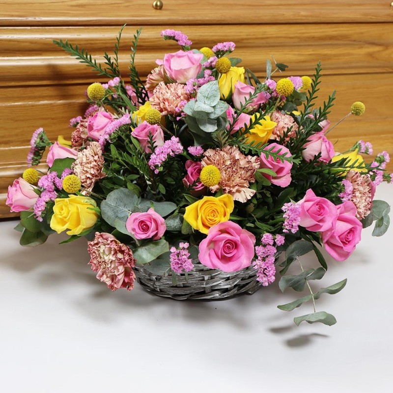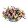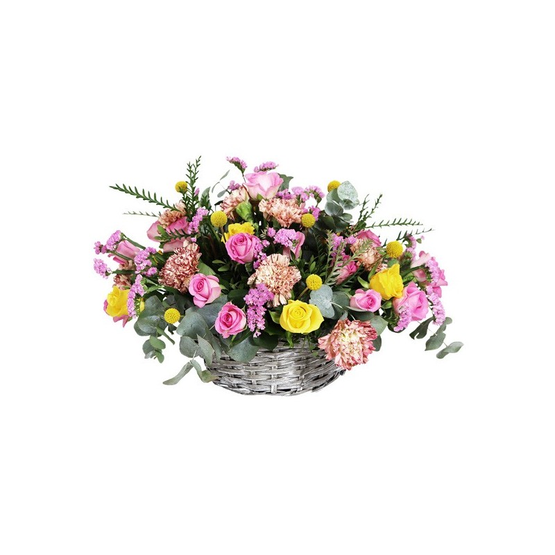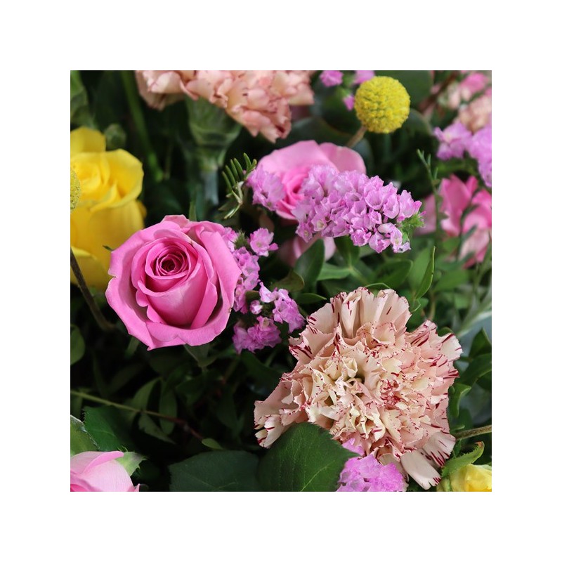 Composition florale dans les tons roses et jaunes composée de roses, oeillets, fleurettes et feuillages. Le contenant peut varier en fonction des disponibilités du fleuriste en charge de votre commande.