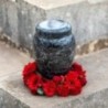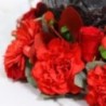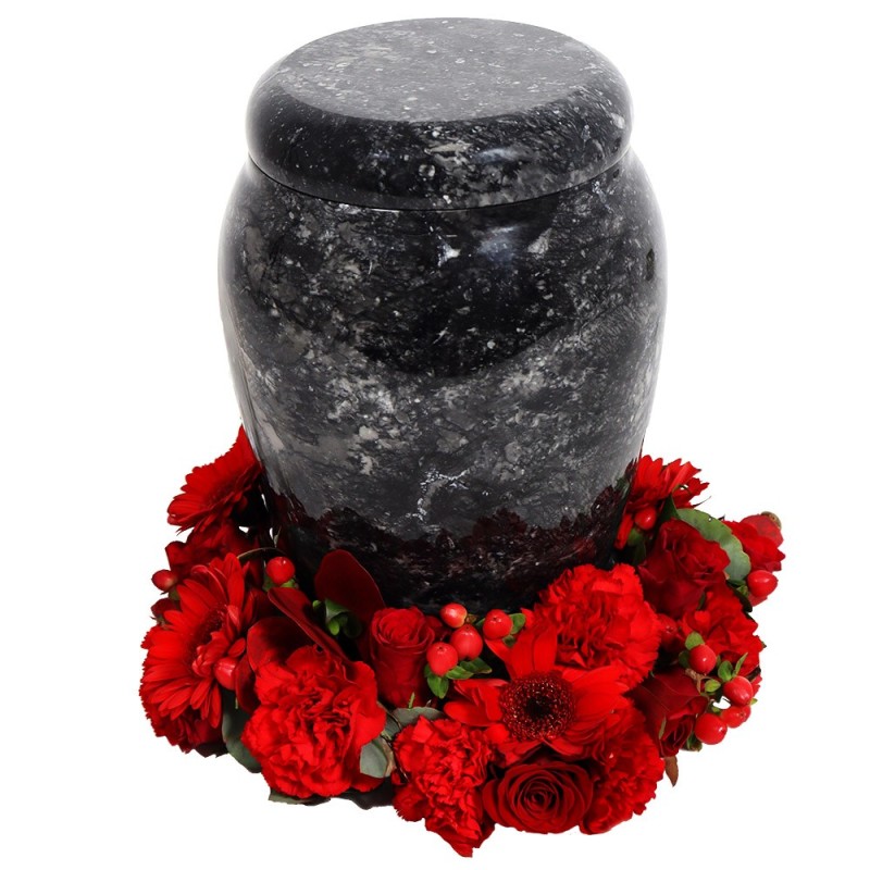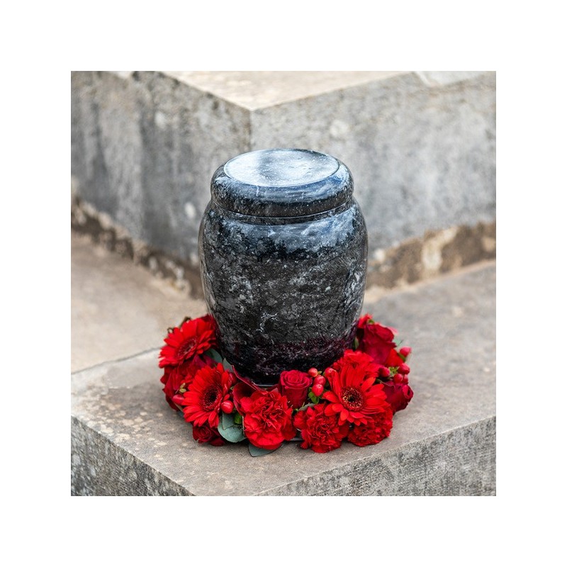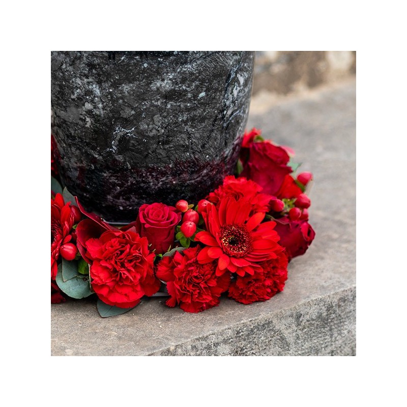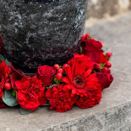 Couronne d'urne dans les tons rouges composée de germinis, d'oeillets, de roses, fleurettes et feuillages. Urne non fournie.