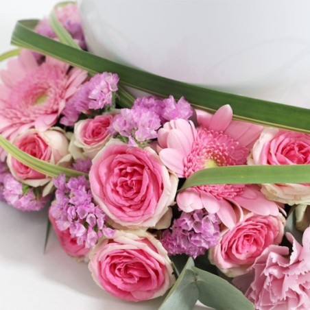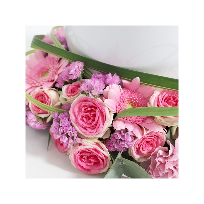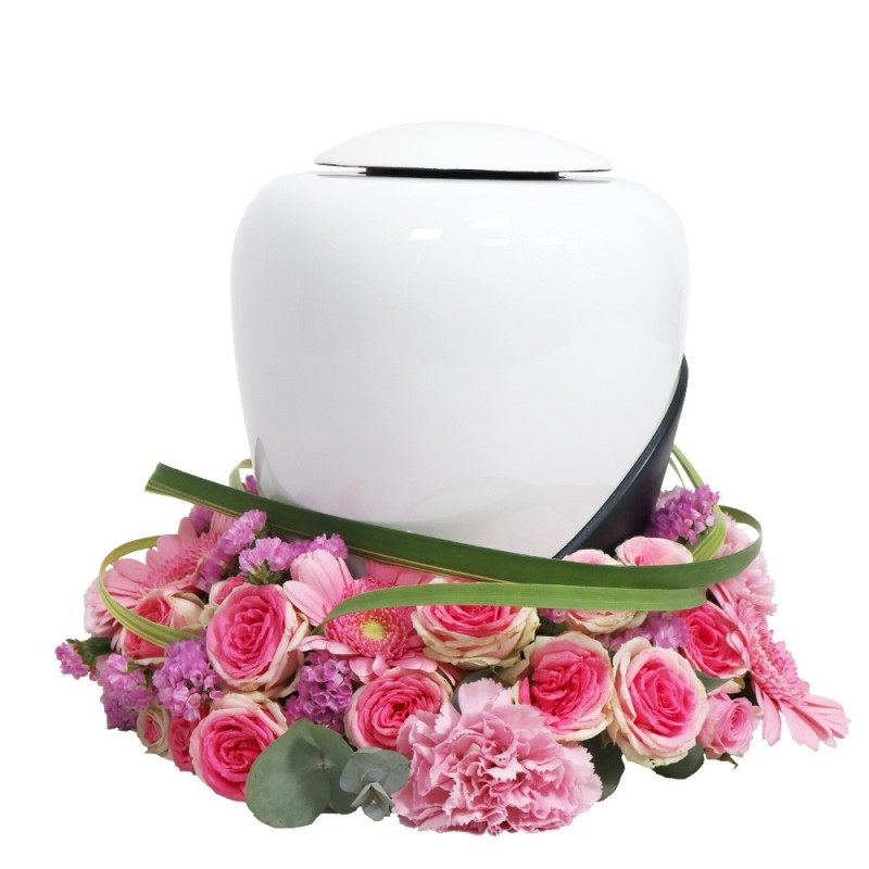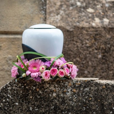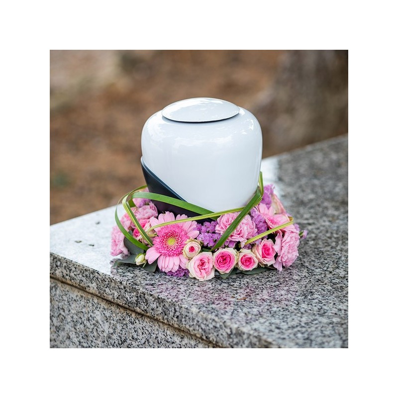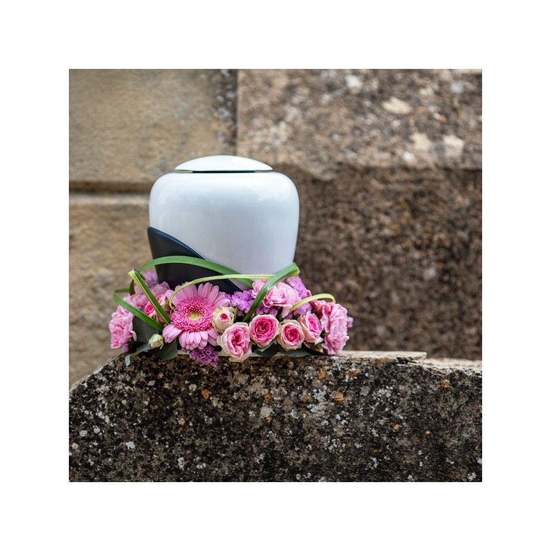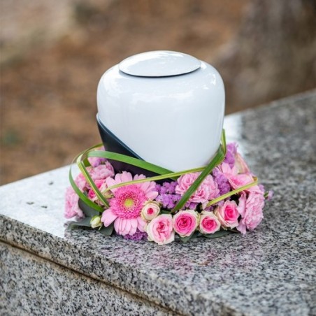 Couronne d'urne dans les tons roses composée de germinis, d'oeillets, de roses et de feuillages. Urne non fournie.