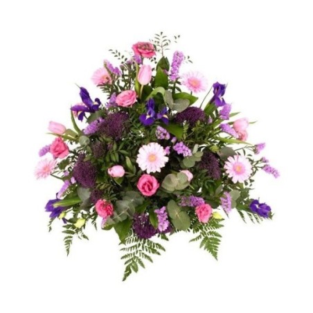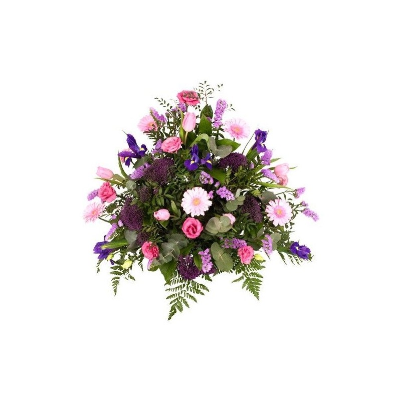 Composition pyramidale dans les tons violet, rose soutenu et rose pale composée de germinis, lysianthus,tulipes roses (peut varier en fonction de la saison), iris bleus (peut varier en fonction de la saison) et autres végétaux.