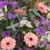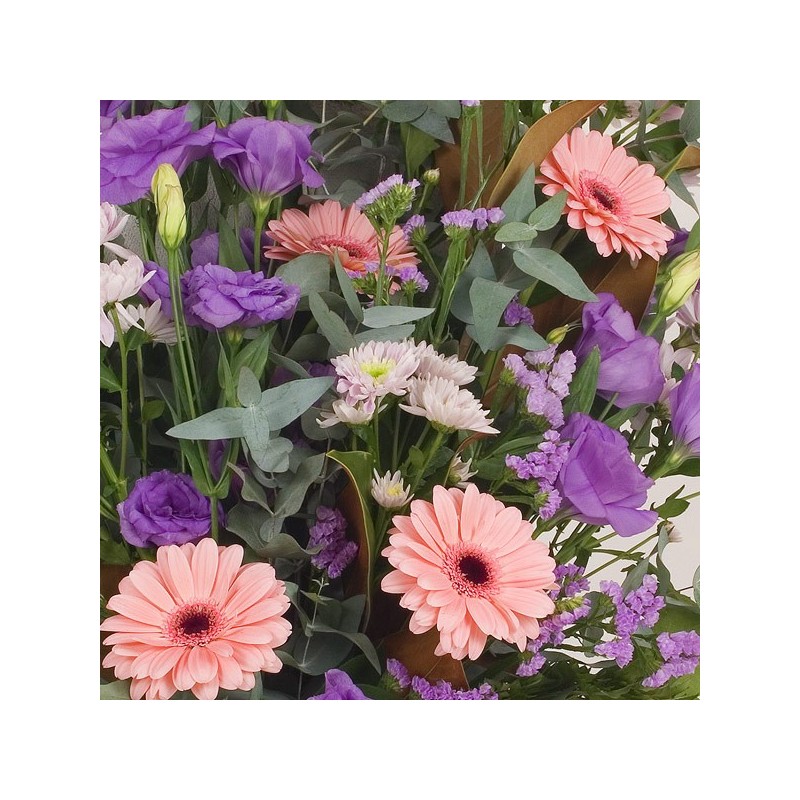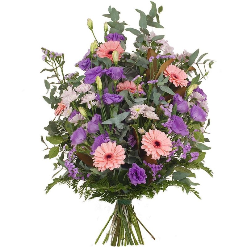 Gerbe Main dans les tons de parme, composée de gerberas, lysianthus, statices et autres fleurs de saison.