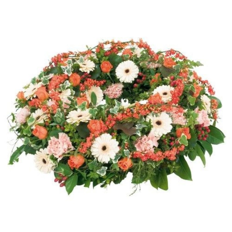 Couronne plate dans les tons d'orangen rouge et crème composée de germinis, roses , œillets orange pale et autres fleurs de saison.