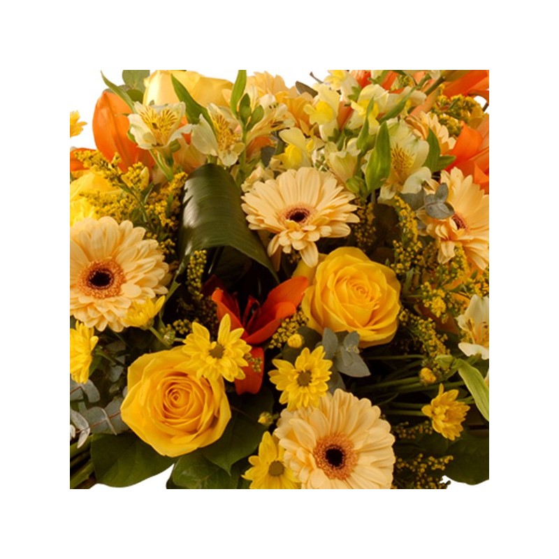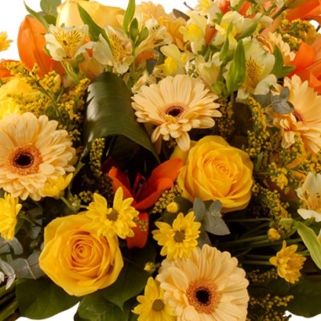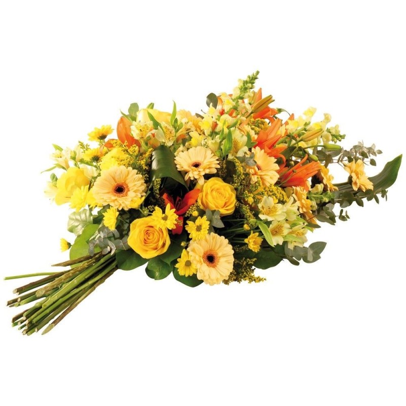 Gerbe main pour deuil dans les tons de jaune avec une touche de orange composé de roses, lys , germinis et autres fleurs de saison.