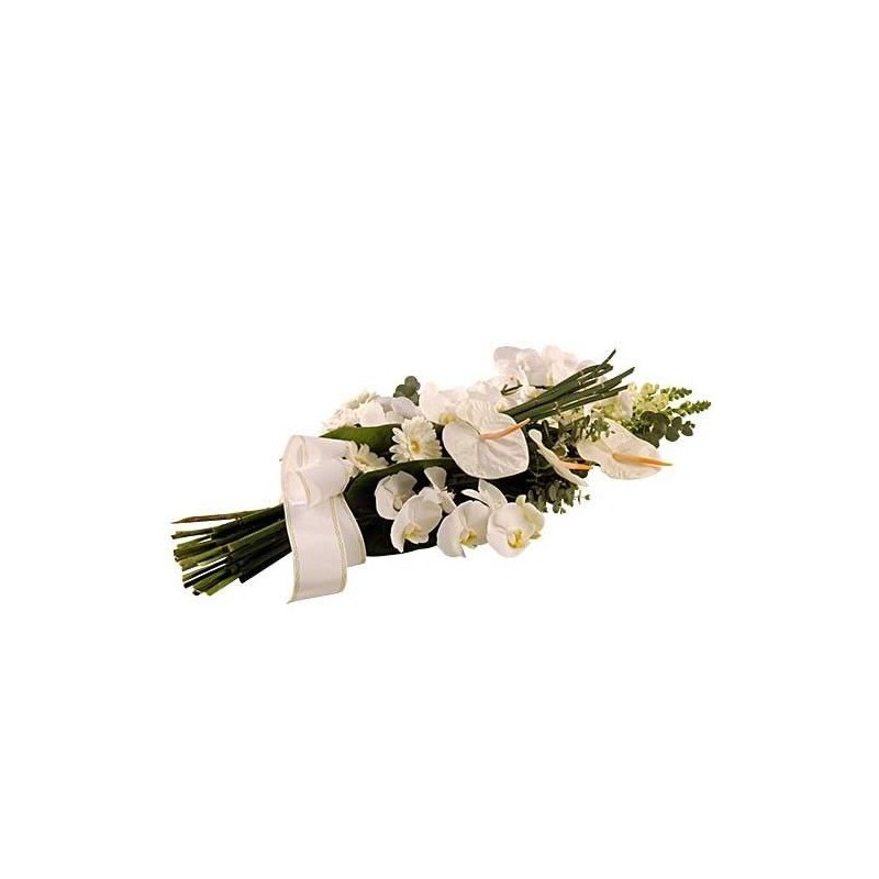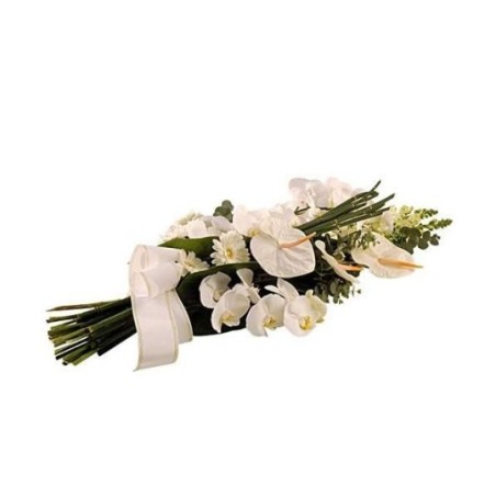 Gerbe main dans les tons de blanc composée de germinis, de branches de phalaenopsis, anthuriums et d'autres fleurs de saison (nœud blanc).