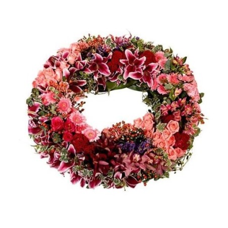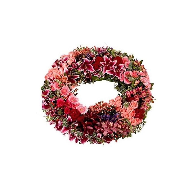 Couronne dans les tons roses, rouges et mauves composée de roses, œillets, lys star-gazer et autres fleurs.