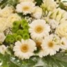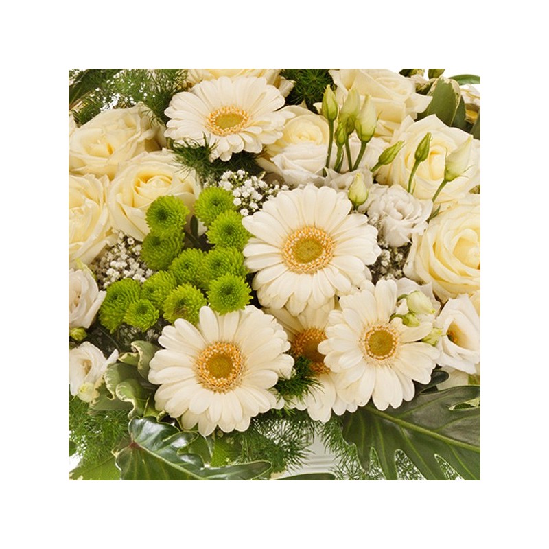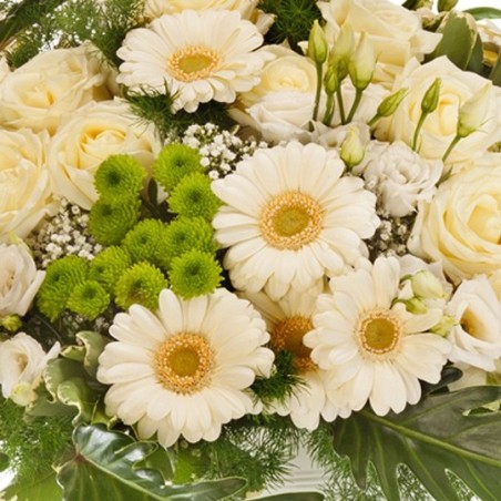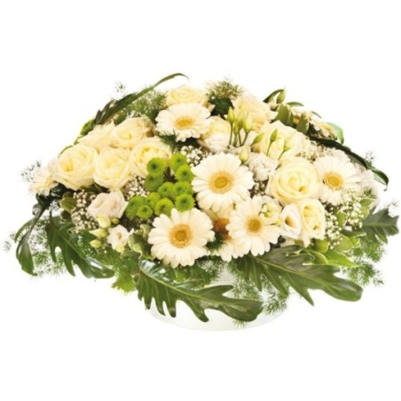 Grande composition de deuil dans les tons blanc et vert composée de roses, gypsophile, germinis, lysianthus et autre fleurs de saison dans un contenant bas de forme ronde en zinc (contenant non contractuel).