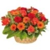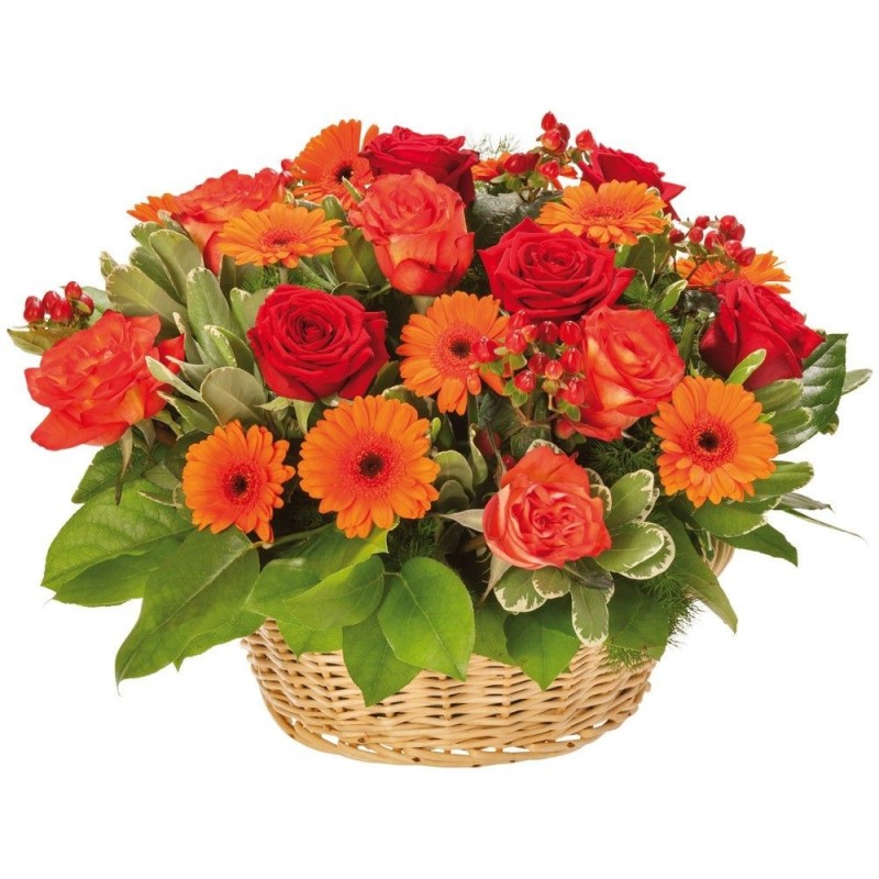 Grande composition de deuil dans les tons rouge, orange foncé et vert composée de germinis, roses et d'autres fleurs de saison dans une vannerie sans anse (contenant non contractuel).
