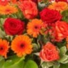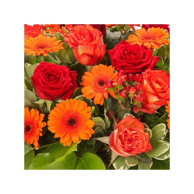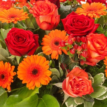 Grande composition de deuil dans les tons rouge, orange foncé et vert composée de germinis, roses et d'autres fleurs de saison dans une vanneri...