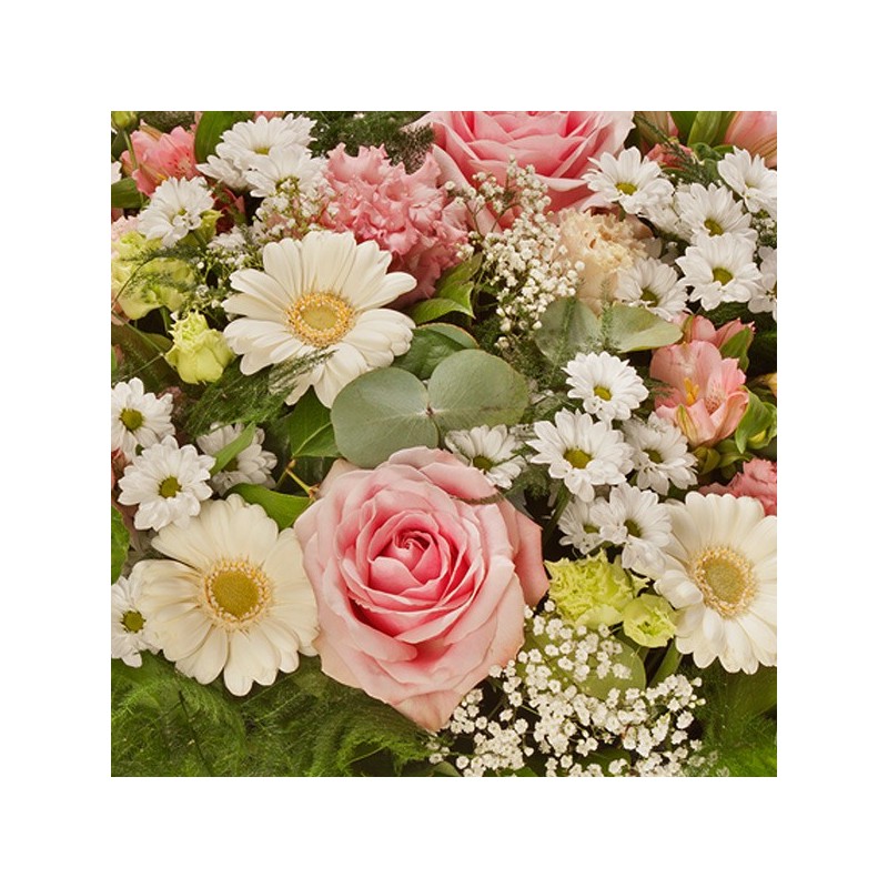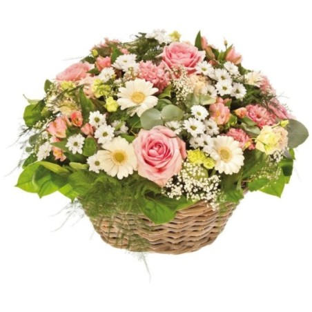 Grande composition de deuil dans les tons rose pâle, blanc et vert composée de roses rose clair, alstromérias, germinis blancs, lysianthus et d'autres fleurs dans un panier en osier sans anse (contenant non contractuel).