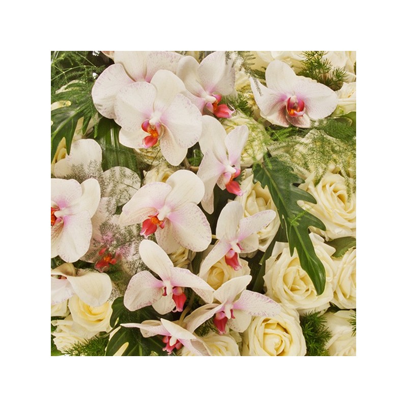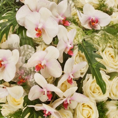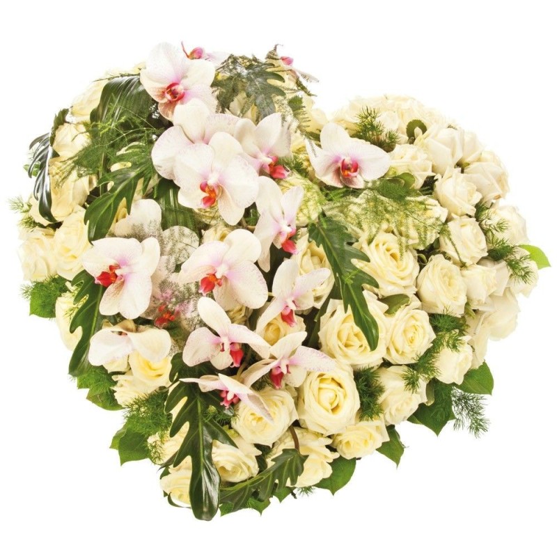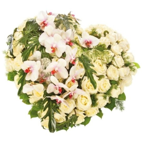 Cœur de deuil dans les tons blanc et vert avec une touche de rose composé de roses blanches essentiellement, aspidistra, pittosporum, salal, miriocladus, philoxanadu, phalaenopsis blanc au cœur rose et asparagus plumosus.