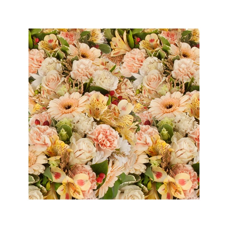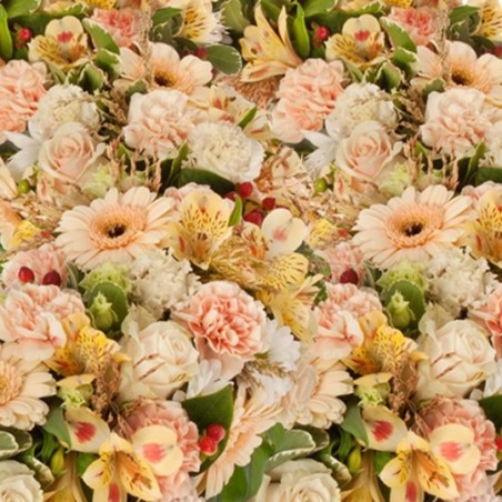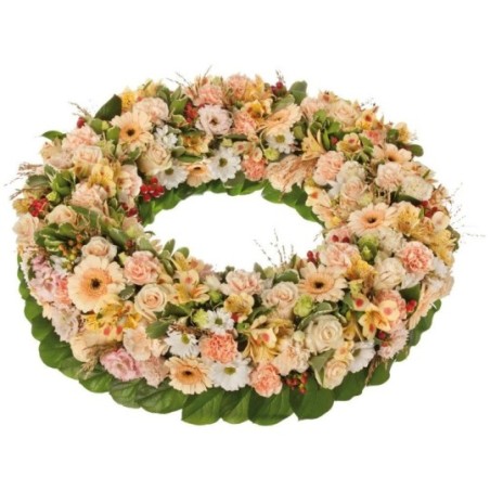 Couronne dans les tons saumon, blanc, rose et vert composée d’œillets, roses, alstromérias et autres fleurs de saison.
