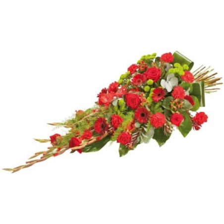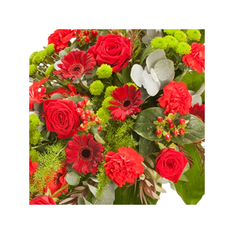 Gerbe main dans les tons rouge et vert composée de glaieuls, roses, hypericum, germinis, œillets, santinis verts, leucodendron, salal, asparagus, aspidistra et eucalyptus.