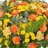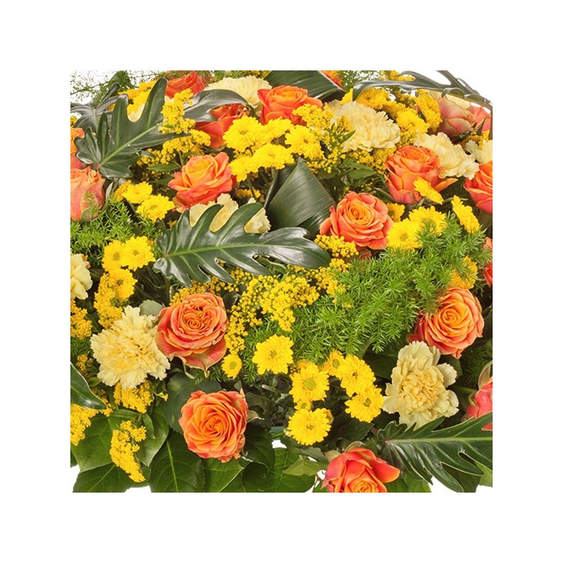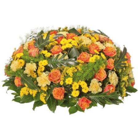 Coussin de deuil dans les tons orange, beige et jaune composé de roses, santini, œillets beige et autres végétaux.