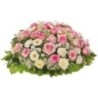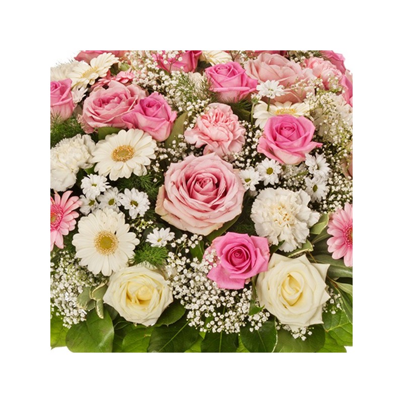 Coussin dans les tons rose et blanc composé d'aralia fastia, salal, pittosporum, mirio, santinis blancs au cœur vert, œillets blancs, roses rose soutenu et rose plus clair,gypsophile, germinis blancs, roses blanches et roses aqua.