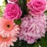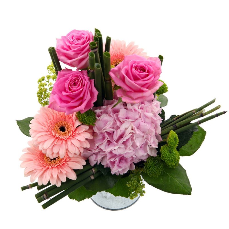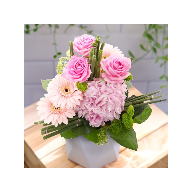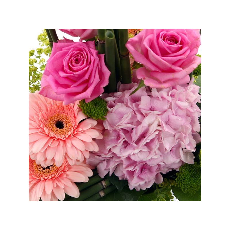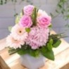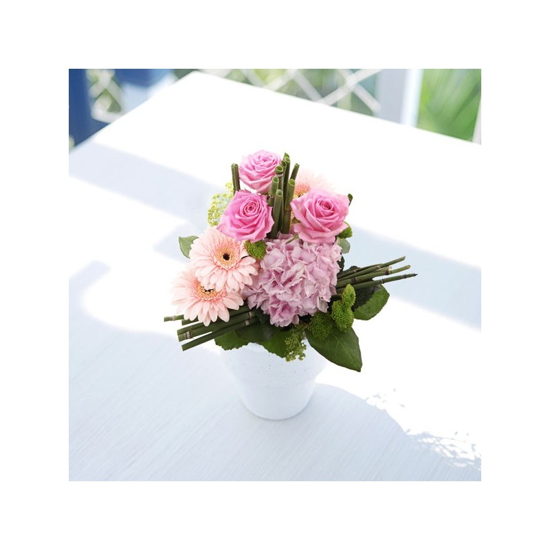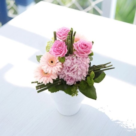 Composition piquée dans les tons rose et saumon composée de roses, gerberas, hortensias et fleurettes le tout accompagné de son feuillage dans un contenant rond. Le contenant peut varier en fonction de la disponibilité du fleuriste en charge de votre commande.