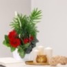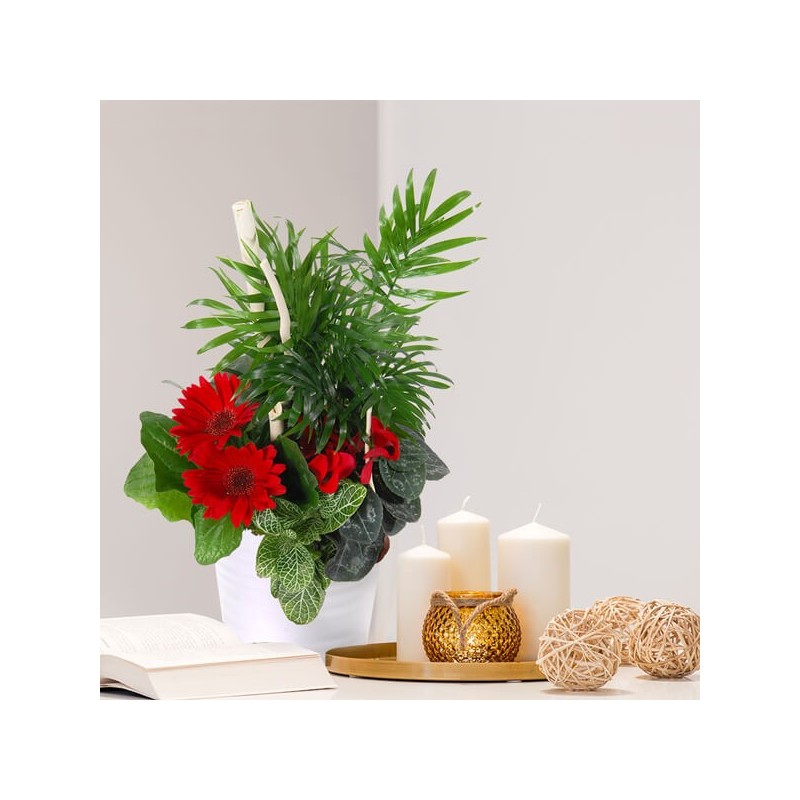 Coupe de plantes dans les tons rouges et verts composée de cyclamens, gerberas et feuillages. Le contenant peut varier en fonction des disponibilités du fleuriste en charge de votre commande.