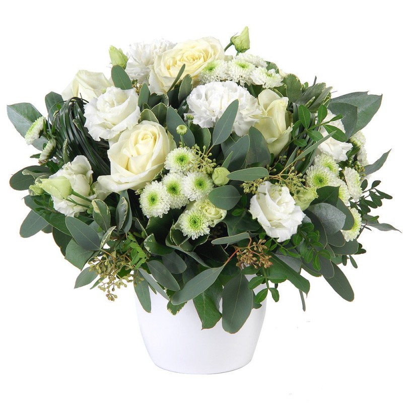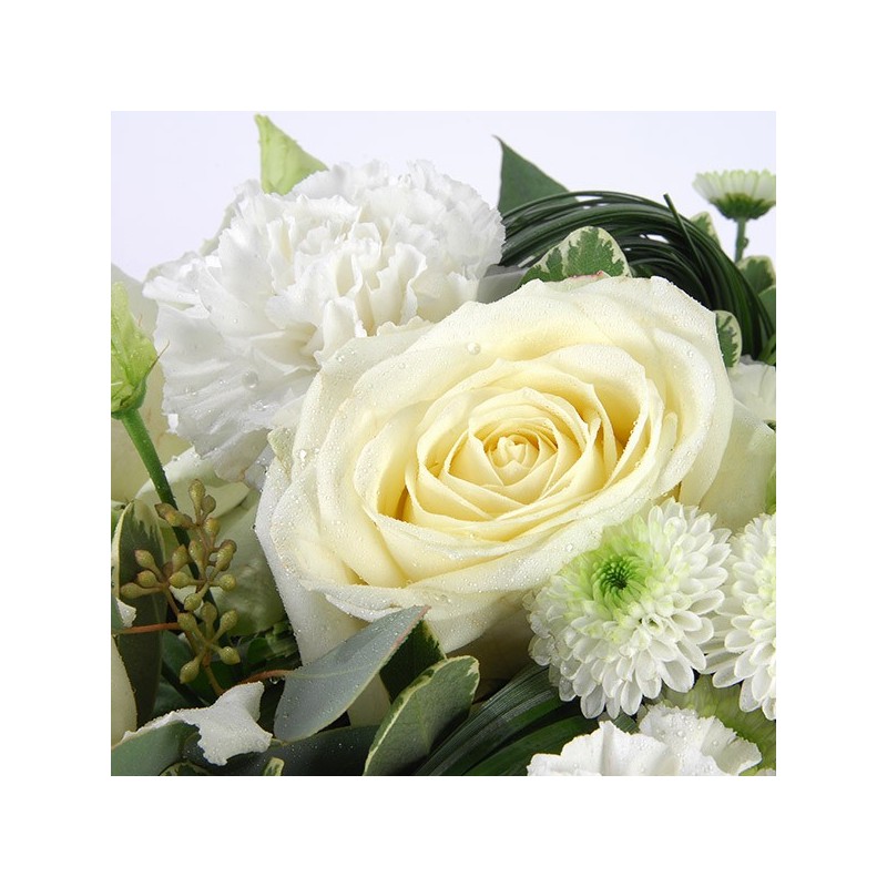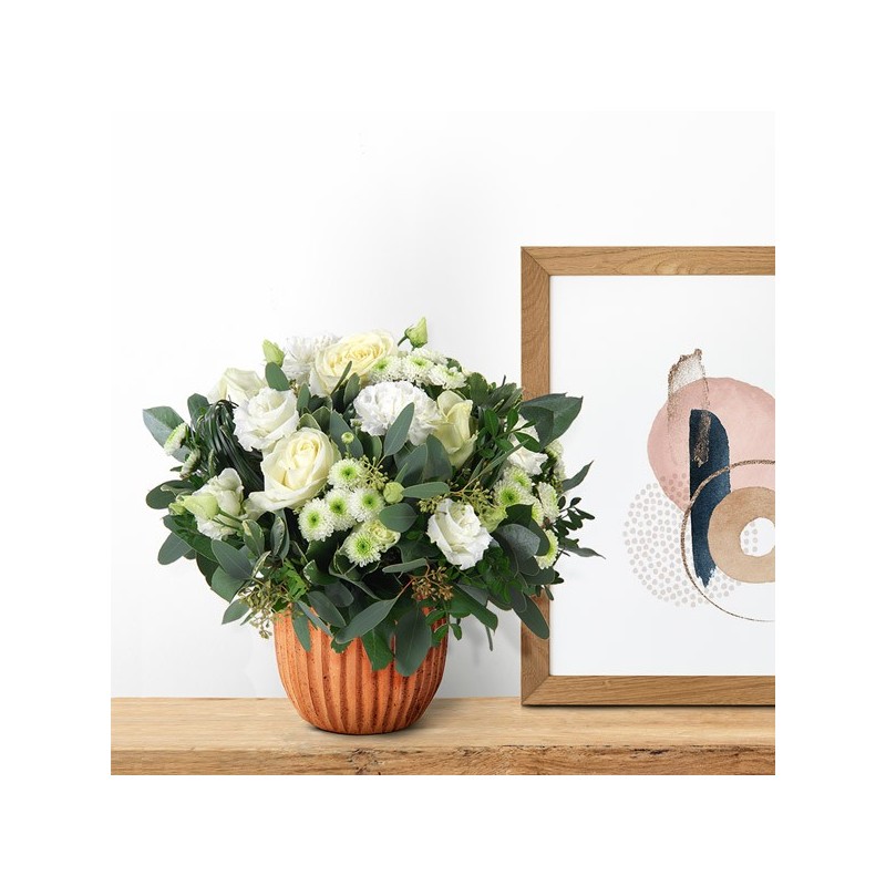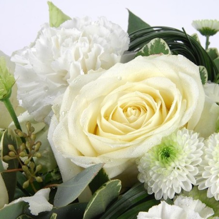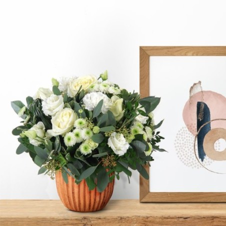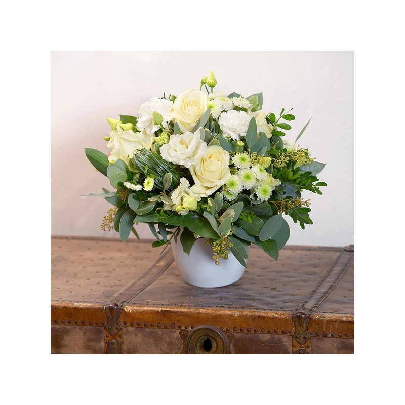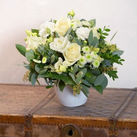 Composition dans les tons blancs composée de roses, lisianthus, eucalyptus et fleurettes de saison dans un contenant. Le contenant peut varier en fonction de la disponibilité du fleuriste en charge de votre commande.