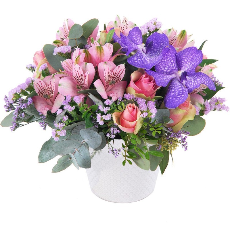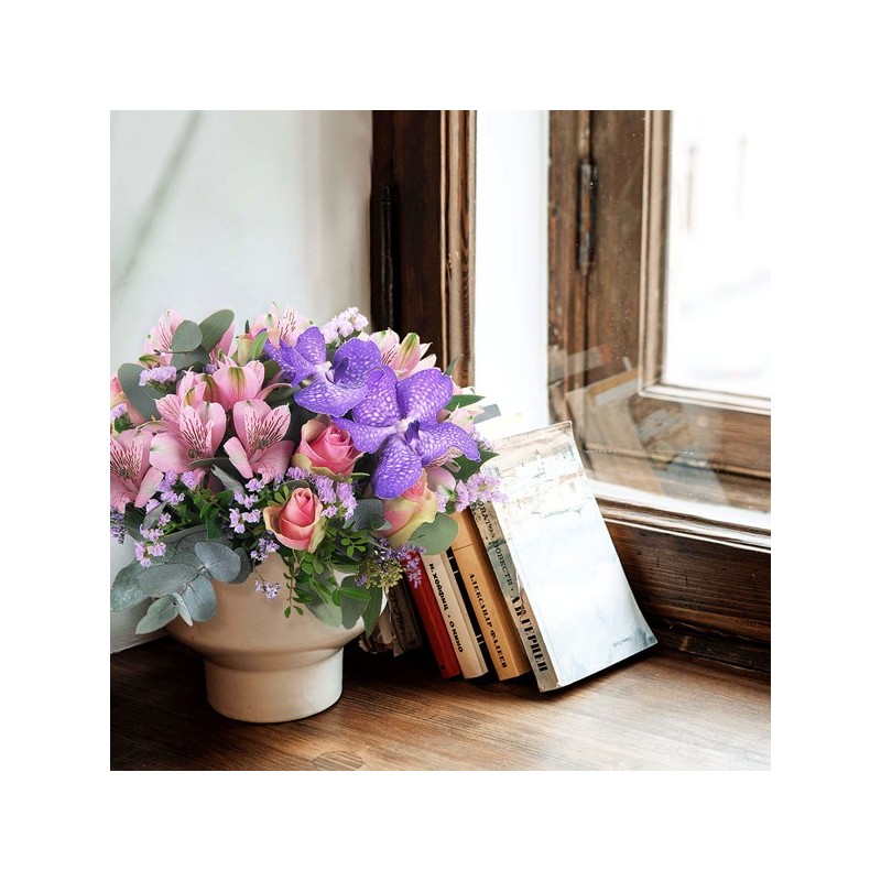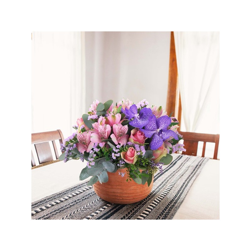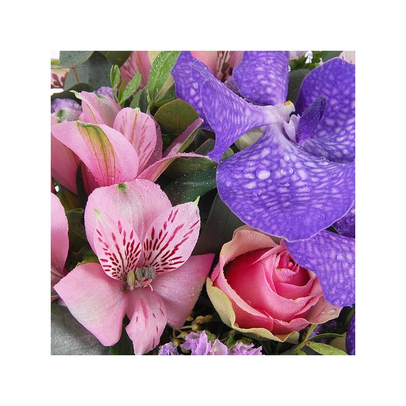 Composition piquée dans les tons rose et violet, composée d'alstromerias, de têtes d'orchidées, de roses et autres fleurs de saison, le tout dans un contenant. Le contenant peut varier en fonction de la disponibilité du fleuriste en charge de votre commande.
