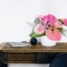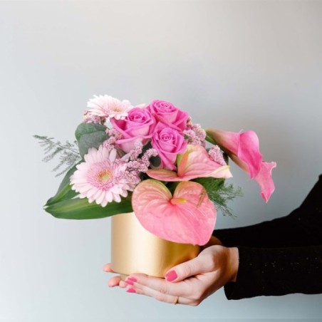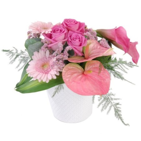 Composition piquée dans les tons roses composée de roses, anthuriums, germinis et autres fleurs de saison le tout dans un contenant. Le contenant peut varier en fonction des disponibilités du fleuriste en charge de votre commande.