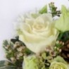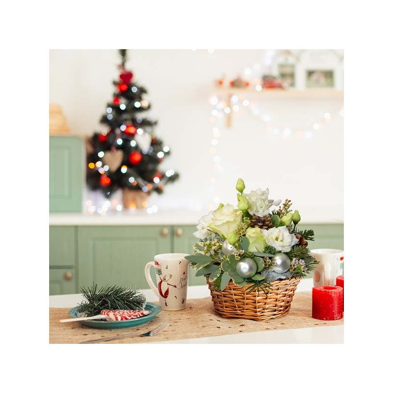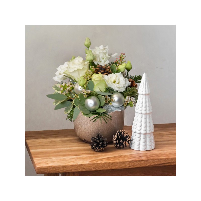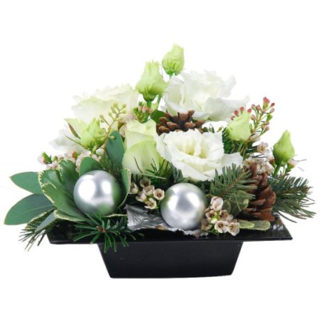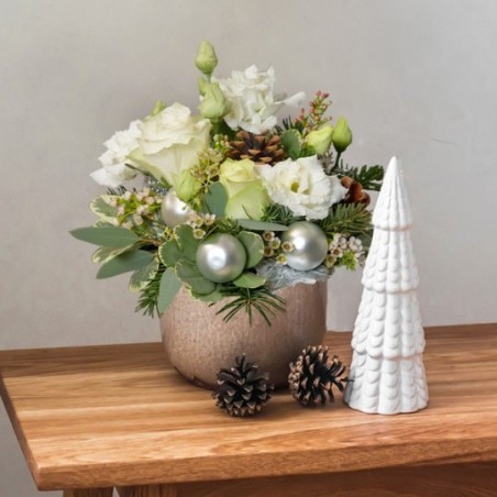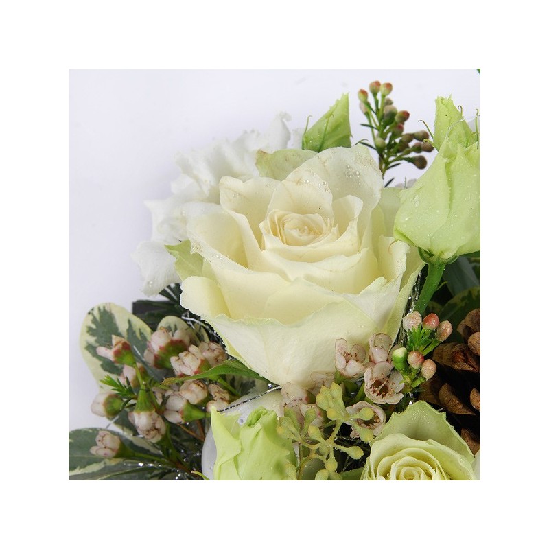 Composition de Noël dans les tons blancs composée de lisianthus, de roses et décorations de Noël. Le contenant peut varie en fonction de la disponibilité du fleuriste en charge de votre commande.