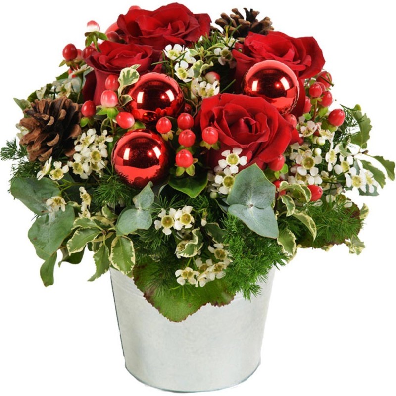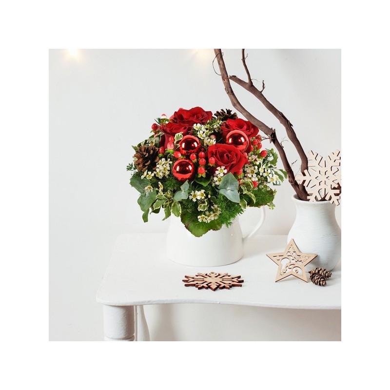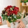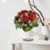 Composition piquée ronde de roses rouges, fleurettes blanches et baies rouges, avec des feuillages variés, déco de Noël, présentée dans un contenant (le contenant peut varier en fonction des disponibilités du fleuriste). La variété et la période peuvent faire varier le prix des roses. Ainsi, pour un tarif affiché, une composition de roses peut être composée d'un nombre différent de tiges.