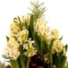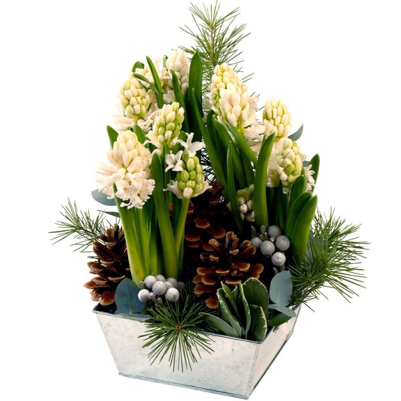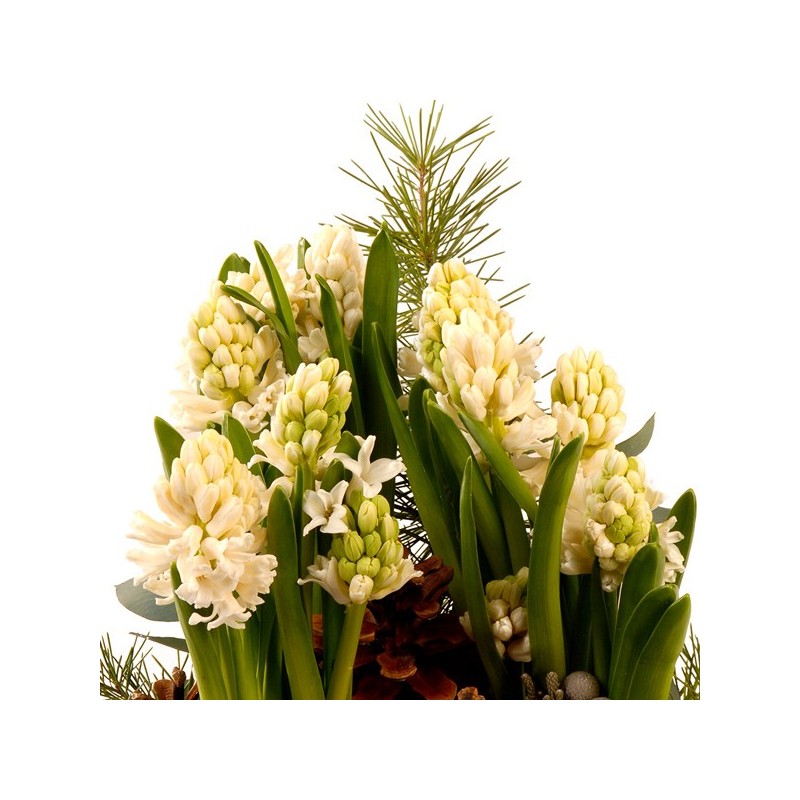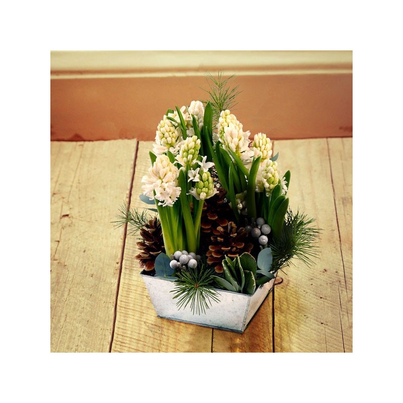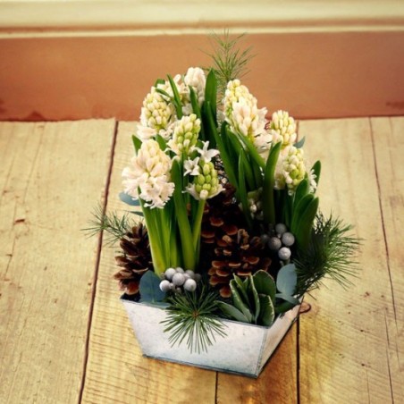 Composition de Noël dans les tons blancs et verts composée de jacinthes, silver brunia, sapin et pommes de pin le tout accompagné de son contenant....