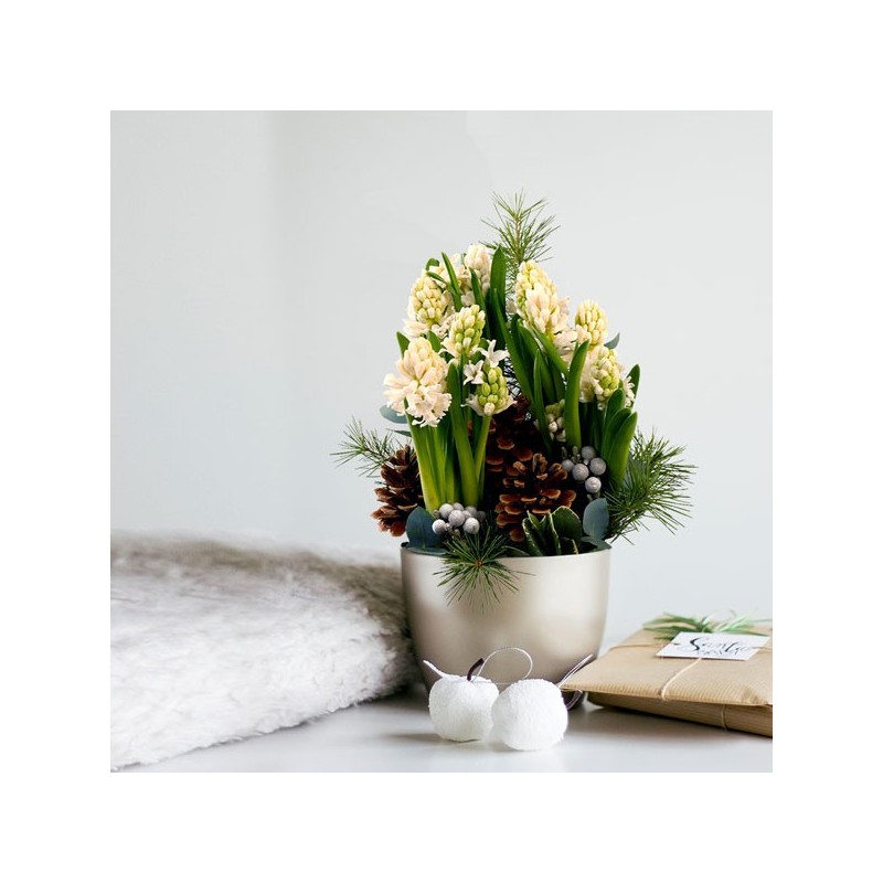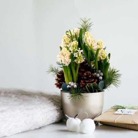Composition de Noël dans les tons blancs et verts composée de jacinthes, silver brunia, sapin et pommes de pin le tout accompagné de son contenant. Le contenant peut varier en fonction de la disponibilité du fleuriste en charge de votre commande.