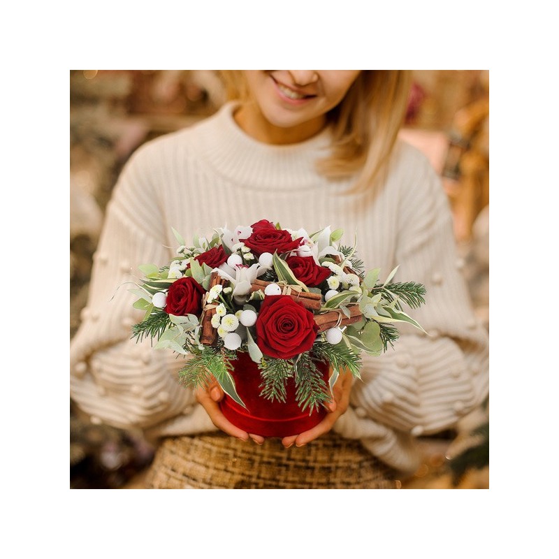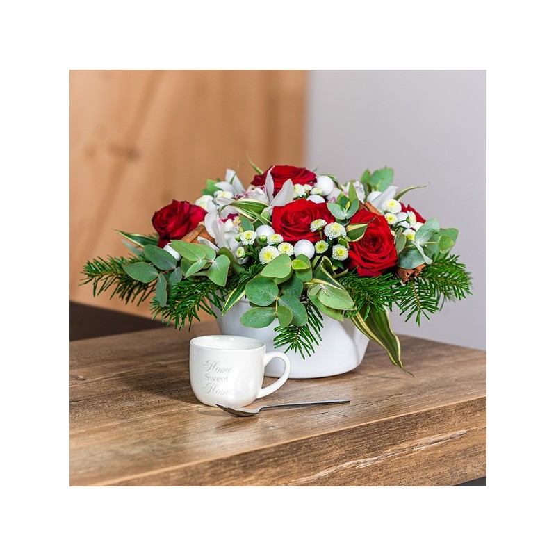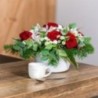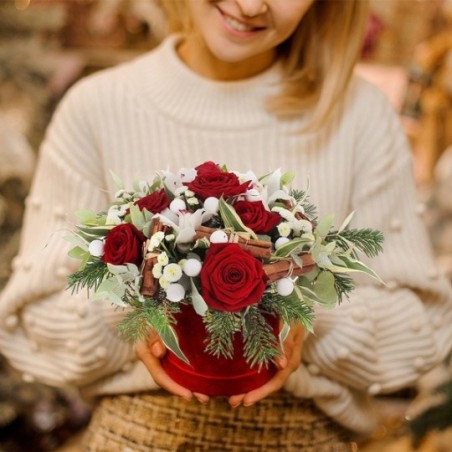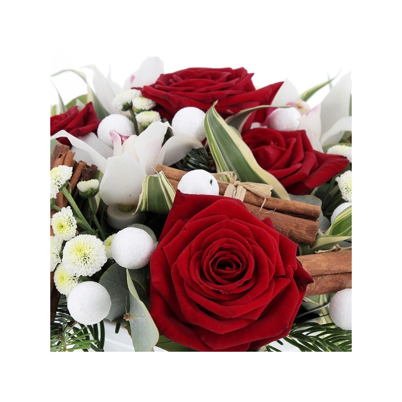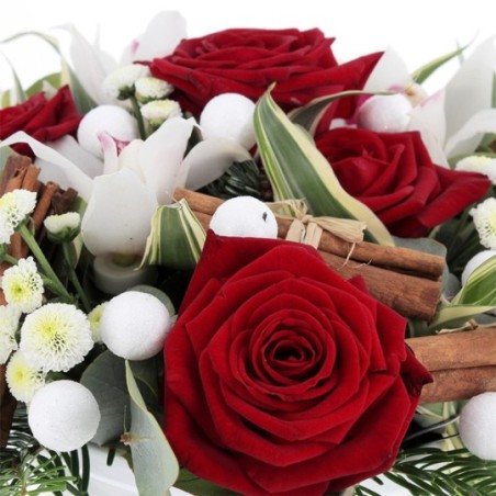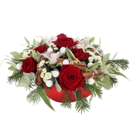 Composition piquée de noel dans les tons rouge et blanc composé de roses, fleurons d'orchidées, boules de noel, et feuillages divers. Le contenant peut varier en fonction des disponibilités chez le fleuriste.