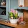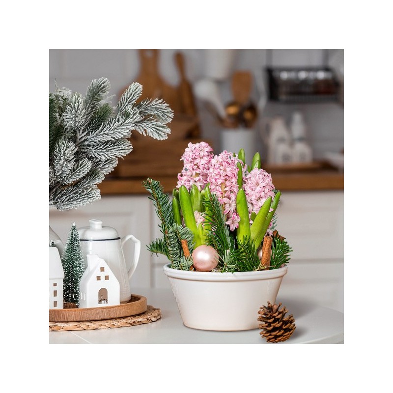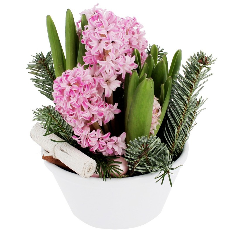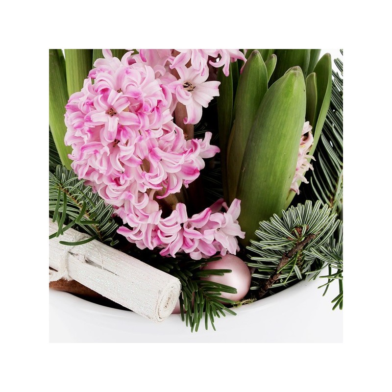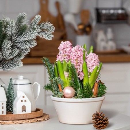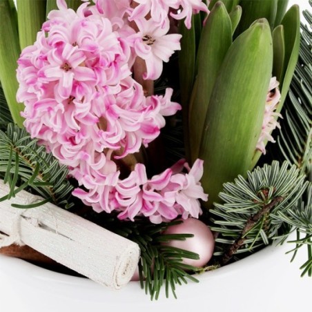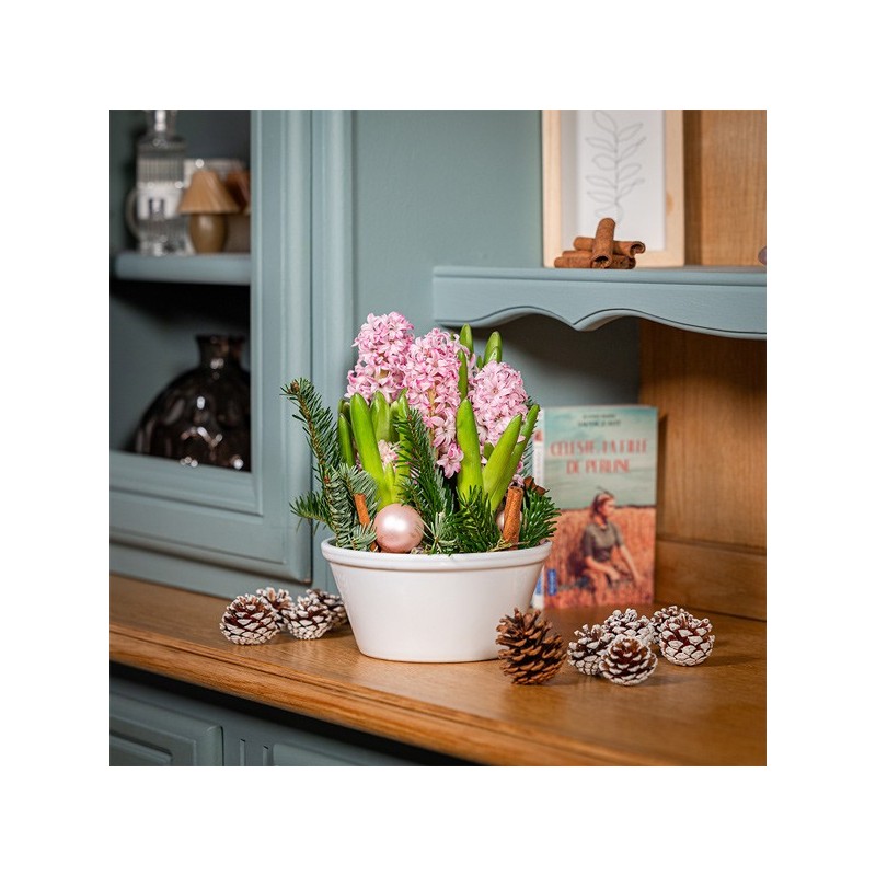 Composition avec des jacinthes roses (bulbes à replanter), mousse et sapin, accessoires (petites boules de noël et bâtons de cannelle) dans un contenant assorti (contenant selon disponibilités du fleuriste).