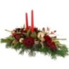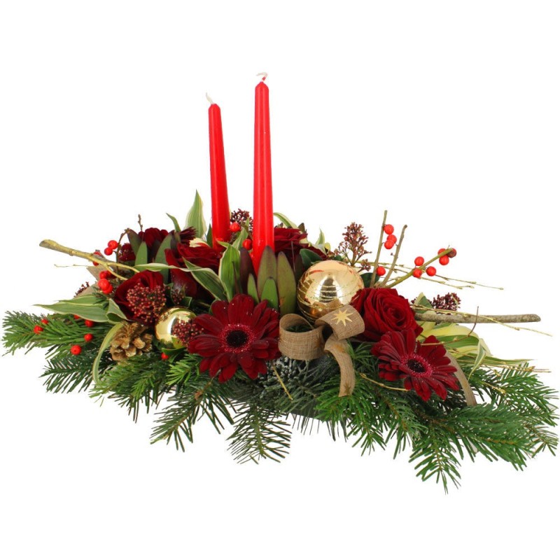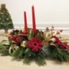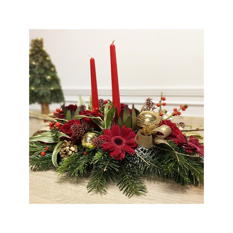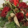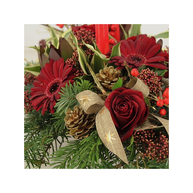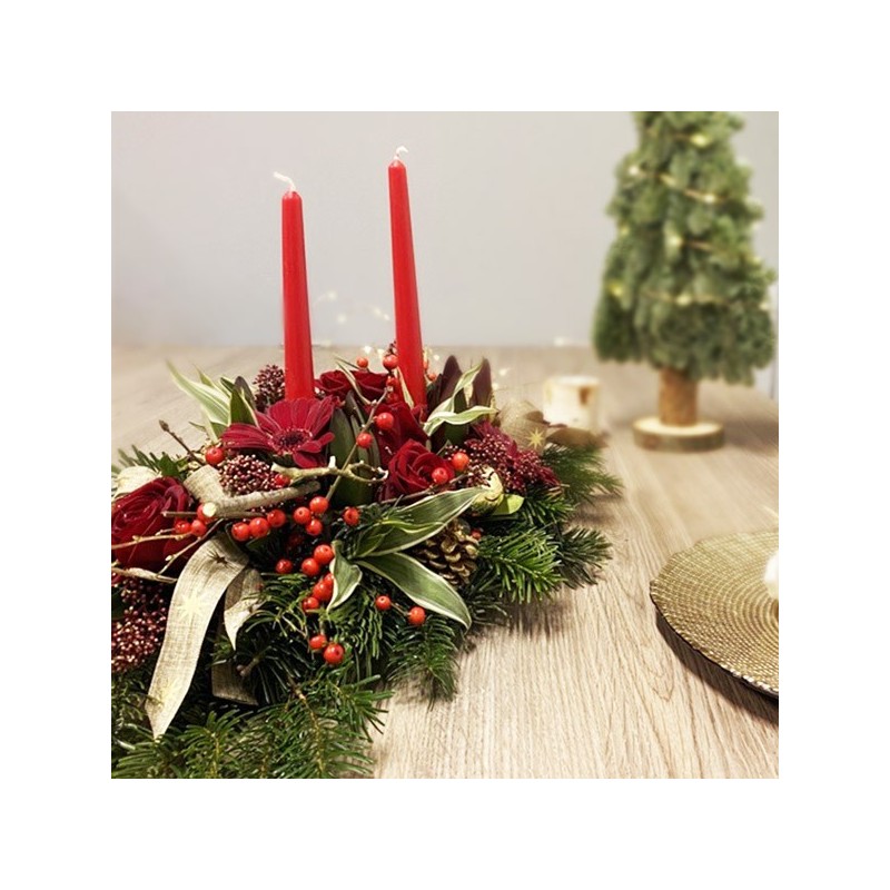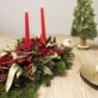Centre de table de Noël dans les tons rouges composé de germinis, roses et dracenas accompagné de sapin et de décorations de Noël.