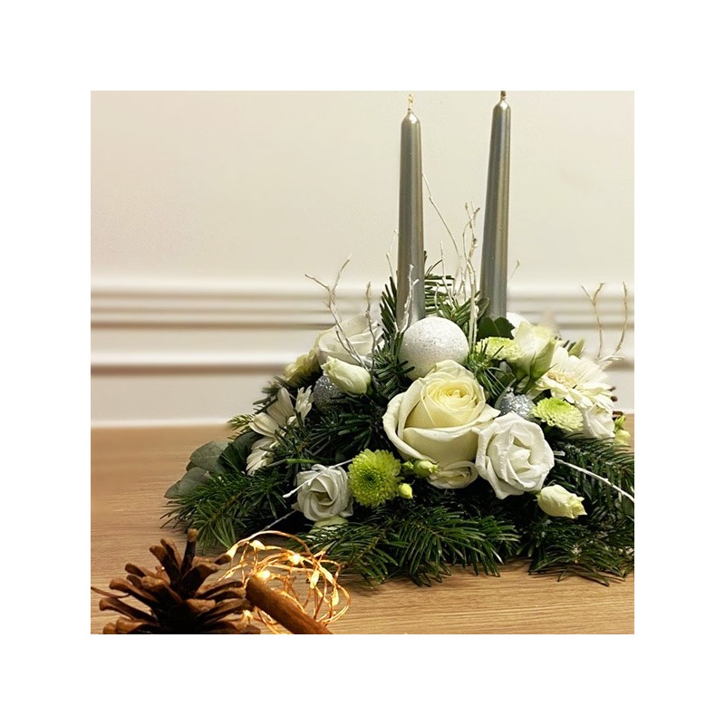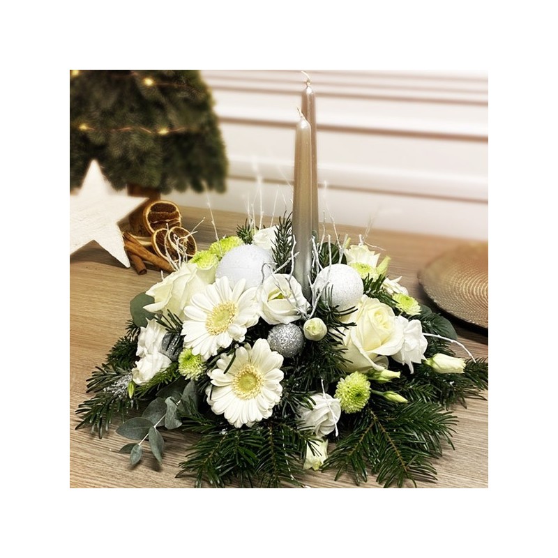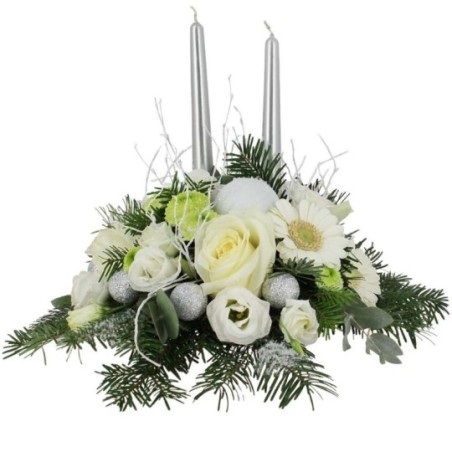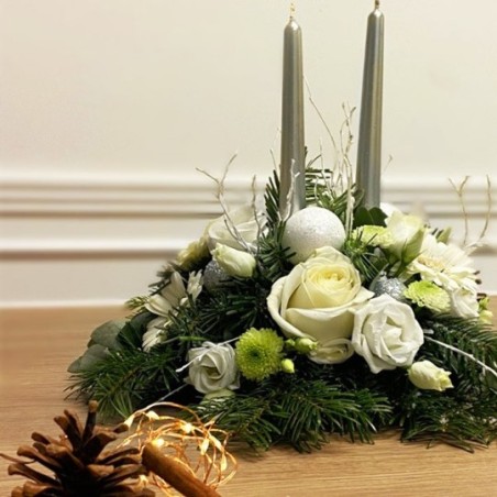 Centre de table de Noël dans les tons blancs et vert composé de roses, germinis , lisianthus accompagnés de bougies, boules de noel et branche de sapin.