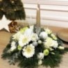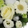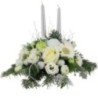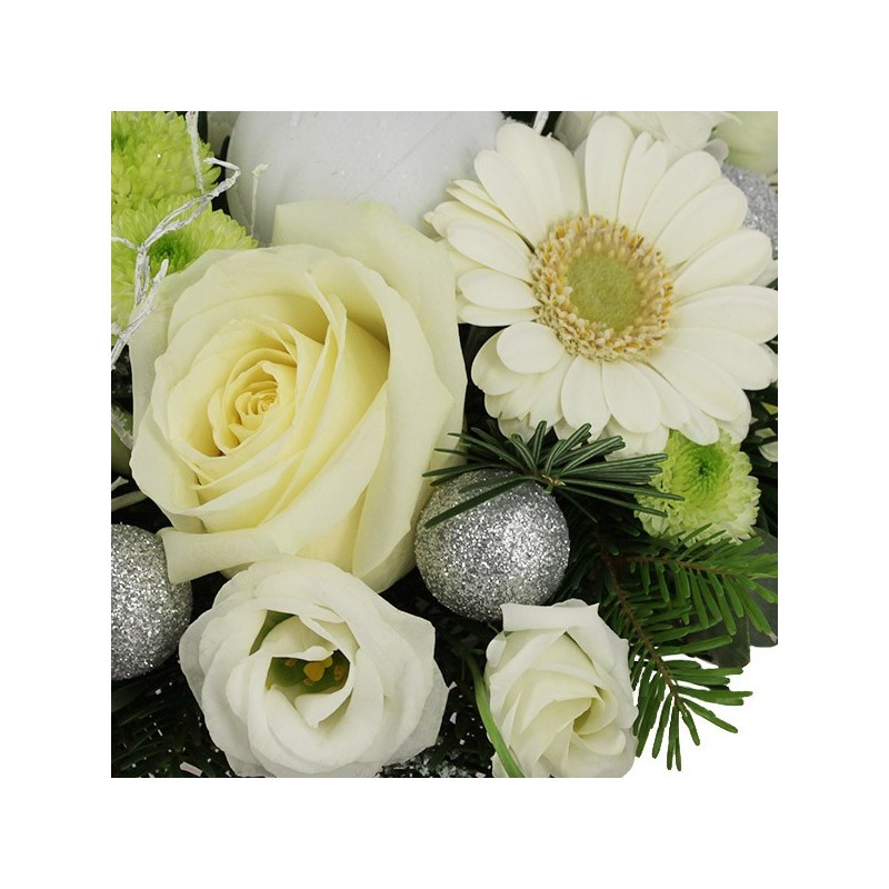 Centre de table de Noël dans les tons blancs et vert composé de roses, germinis , lisianthus accompagnés de bougies, boules de noel et branche de ...
