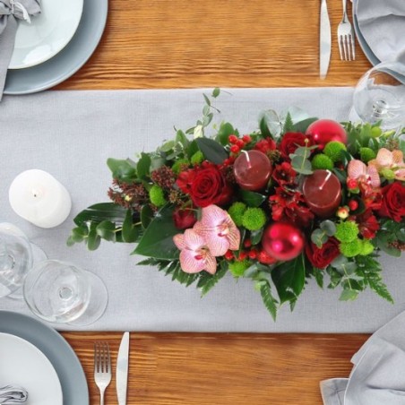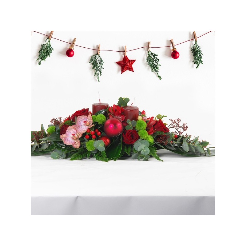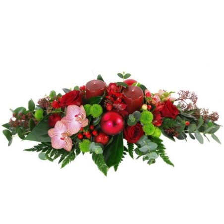 Composition piquée de Noël allongée dans les tons rouge, rose et vert, composée d'orchidées vanda, roses, alstromerias, santinis, boule de noel et bougies, le tout accompagné de feuillage.