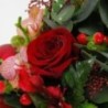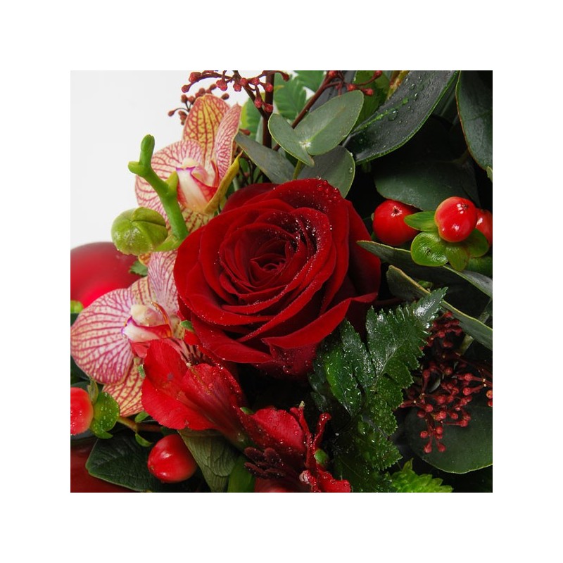 Composition piquée de Noël allongée dans les tons rouge, rose et vert, composée d'orchidées vanda, roses, alstromerias, santinis, boule de noel...