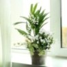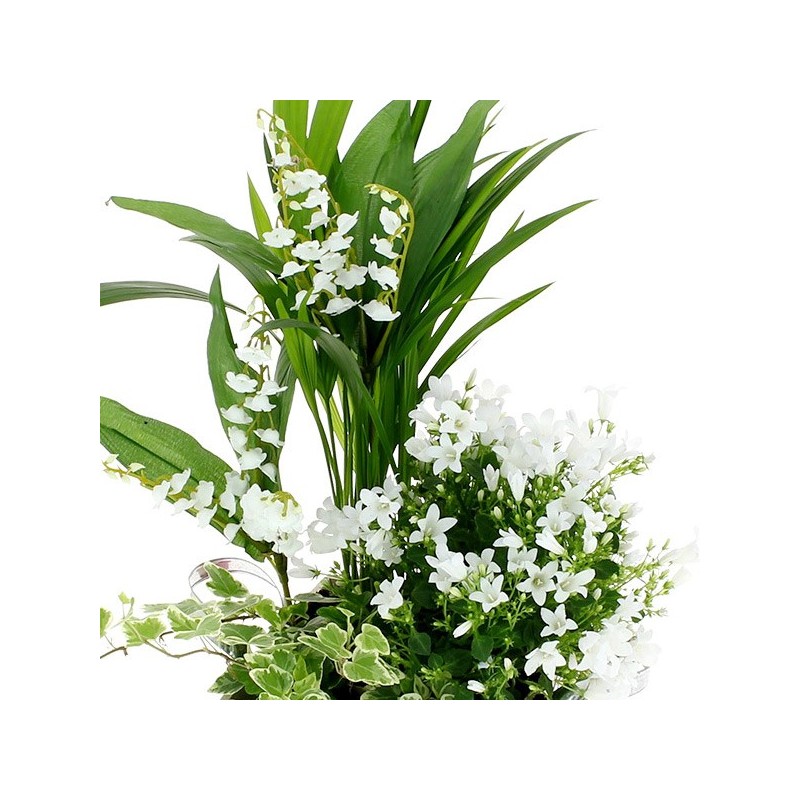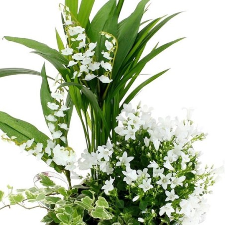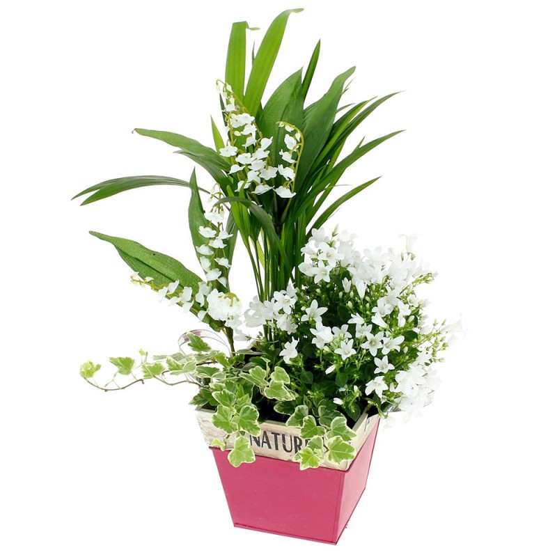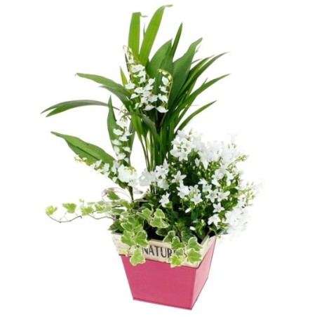 Jardinière de forme carrée ornée de plantes vertes et fleuries, muguet en racines pouvant être replanté et fleurettes blanches (peut varier en fonction en fonction des disponibilités) . Le contenant peut varier en fonction des disponibilités.