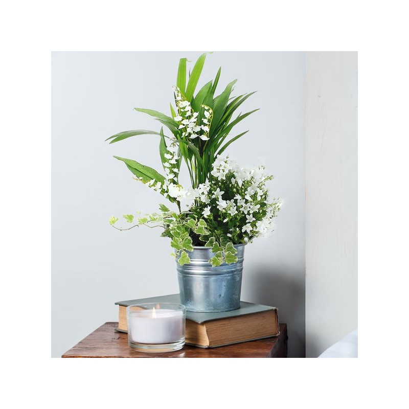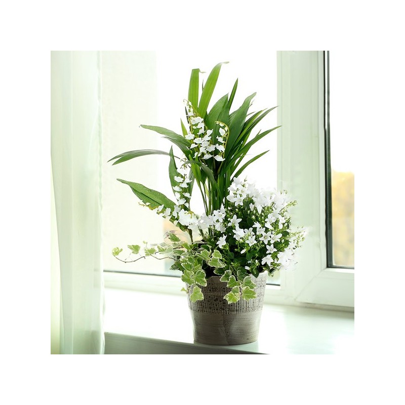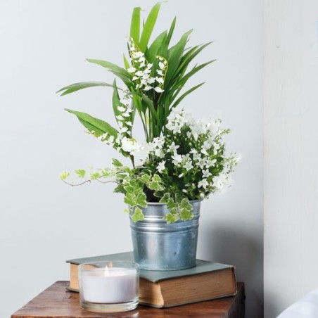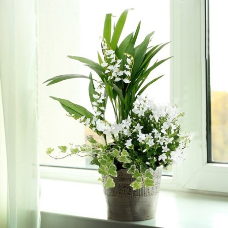 Jardinière de forme carrée ornée de plantes vertes et fleuries, muguet en racines pouvant être replanté et fleurettes blanches (peut varier en fonc...