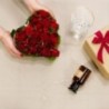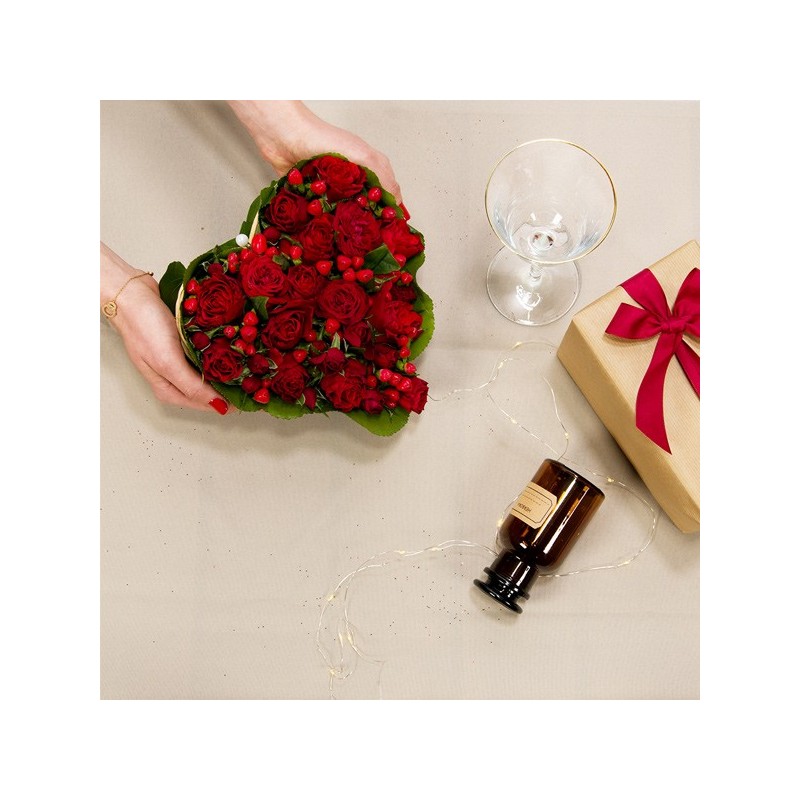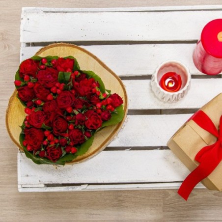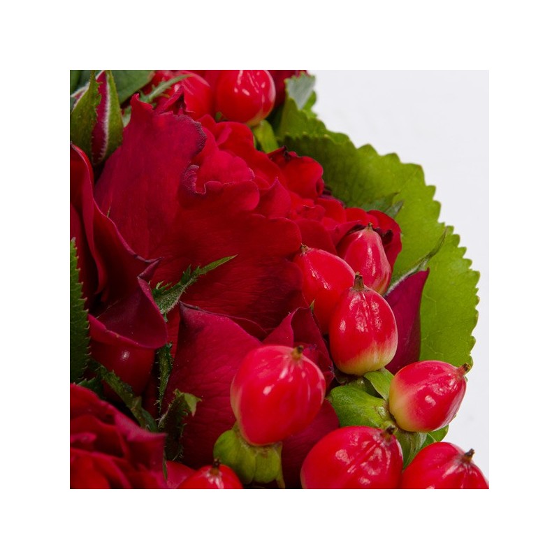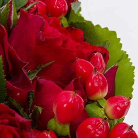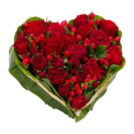 Composition en forme de cœur dans les tons rouge composée de roses et d'hyericum. La variété et la période peuvent faire varier le prix des roses. Ainsi, pour un tarif affiché, une composition de roses peut être composée d'un nombre différent de tiges.