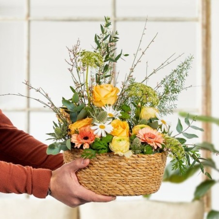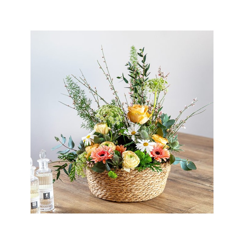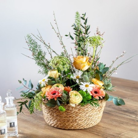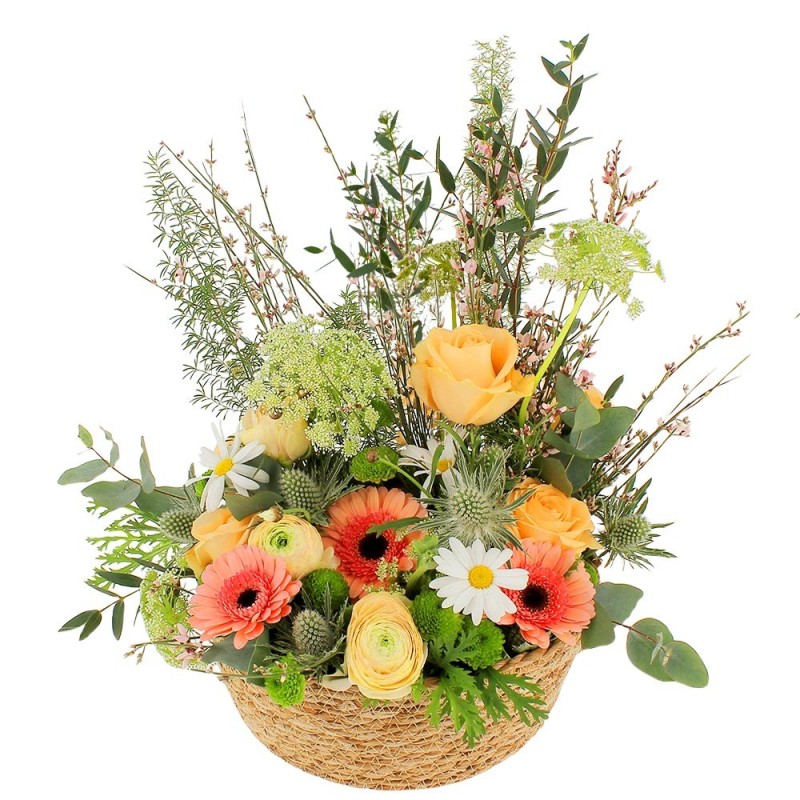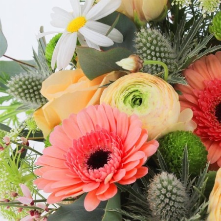 Composition piquée dans les tons pastel et verts. Constituée de roses, renoncules, germinis et ses agréments végétaux, dans son contenant assorti. Le contenant peut varier en fonction de la disponibilité du fleuriste en charge de votre commande.
