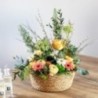 Composition piquée dans les tons pastel et verts. Constituée de roses, renoncules, germinis et ses agréments végétaux, dans son contenant assorti. ...