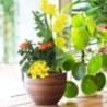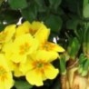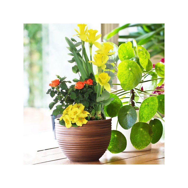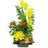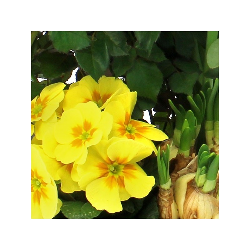 Composition de plantes composée de jonquilles, petit rosier orange, primevère jaune, branches d'eucalyptus et de bâtons de cannelles dans une coupelle noire en zinc de forme carrée (le contenant peut varier en fonction des disponibilités).
