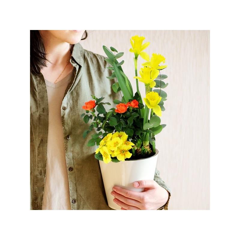Composition de plantes composée de jonquilles, petit rosier orange, primevère jaune, branches d'eucalyptus et de bâtons de cannelles dans une c...