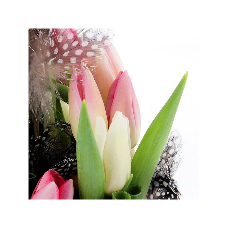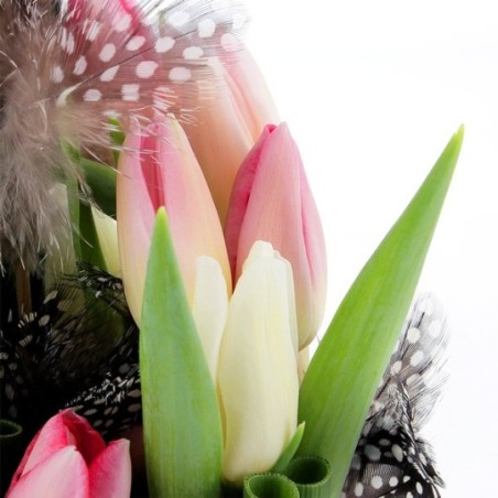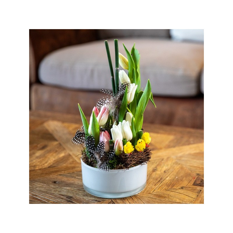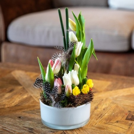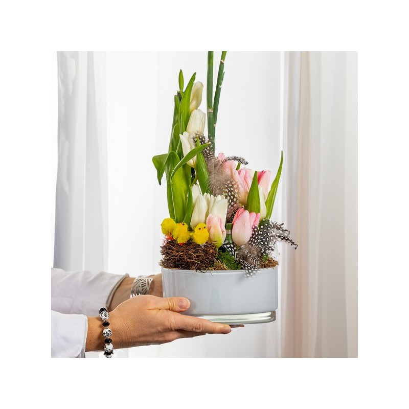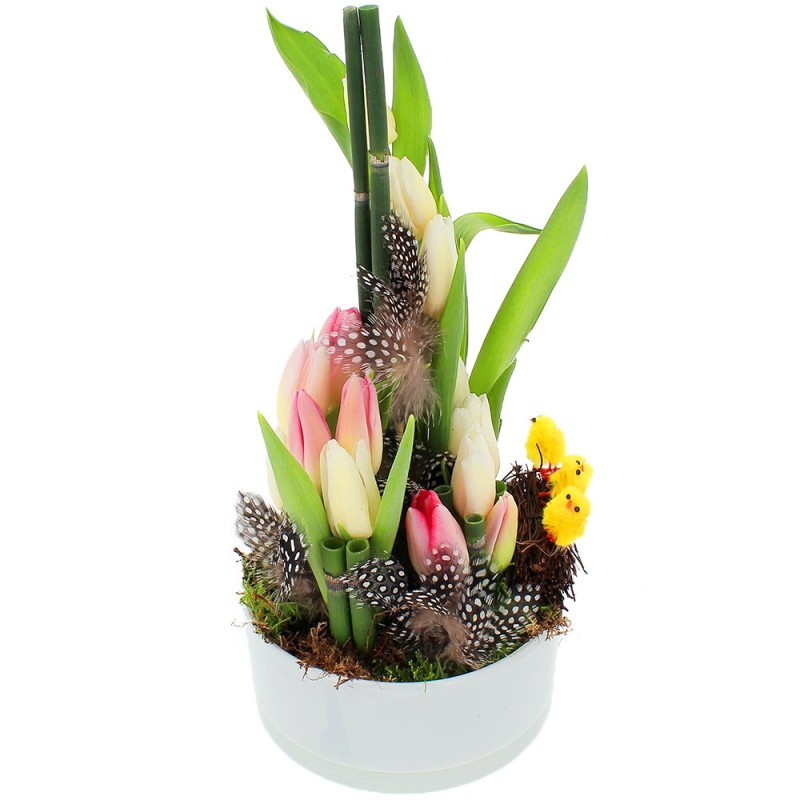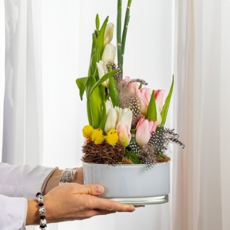 Composition de Pâques dans les tons pastel composée de tulipes et décorations de Pâques. Le contenant ainsi que les décorations de Pâques peuvent varier en fonction des disponibilités du fleuriste en charge de votre commande.