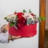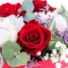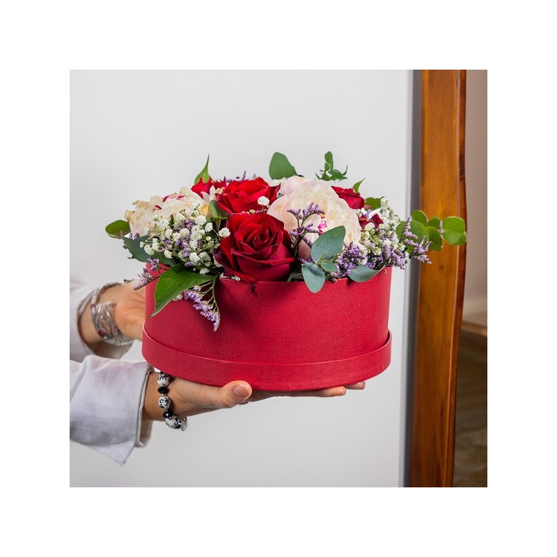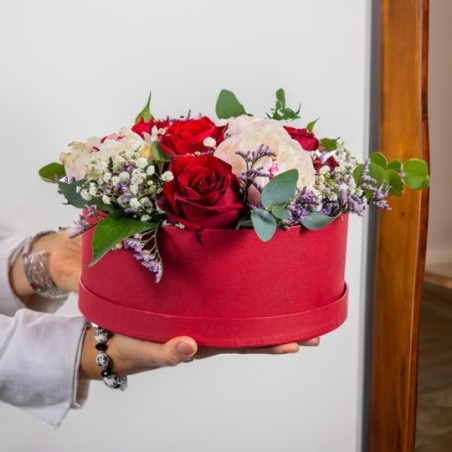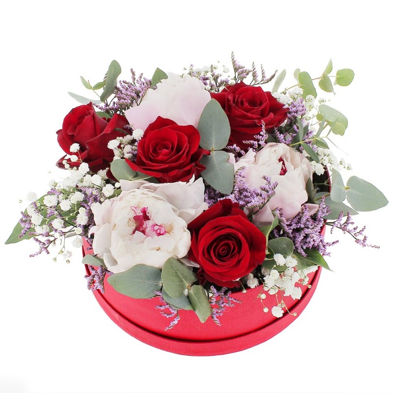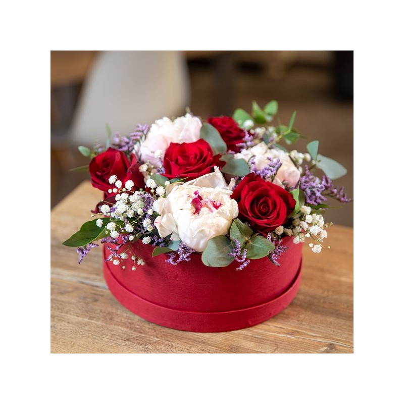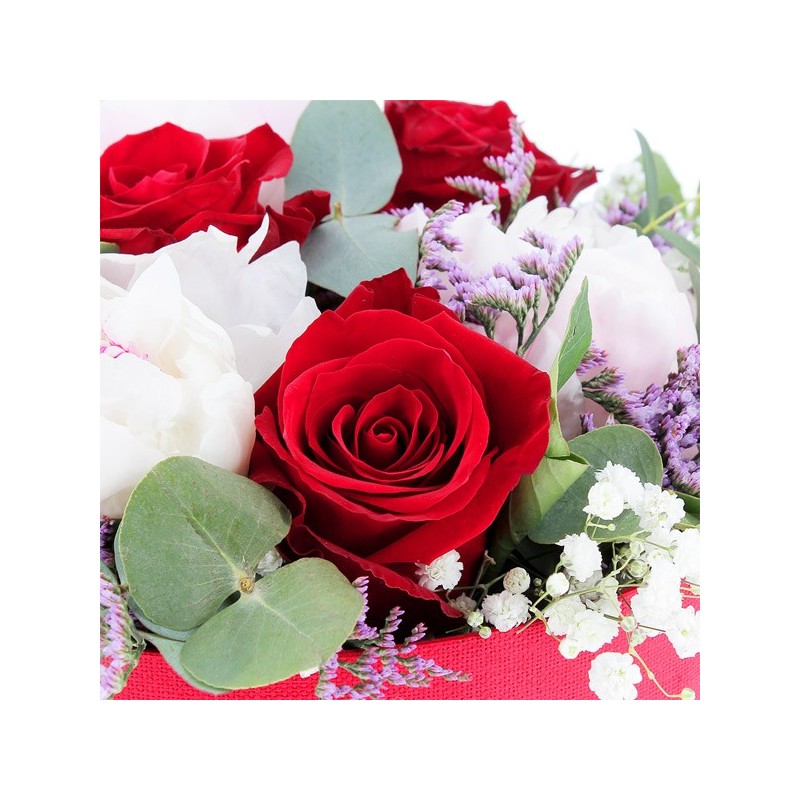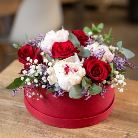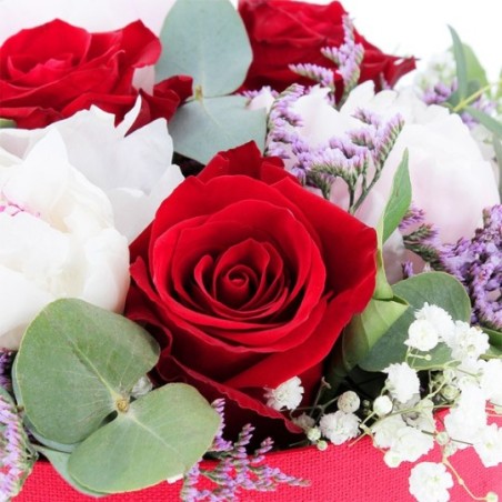 Composition piquée dans les tons rouges et roses composée de pivoines, roses et fleurettes, le tout accompagné de feuillage. Le contenant peut varier en fonction de la disponibilité du fleuriste en charge de votre commande.