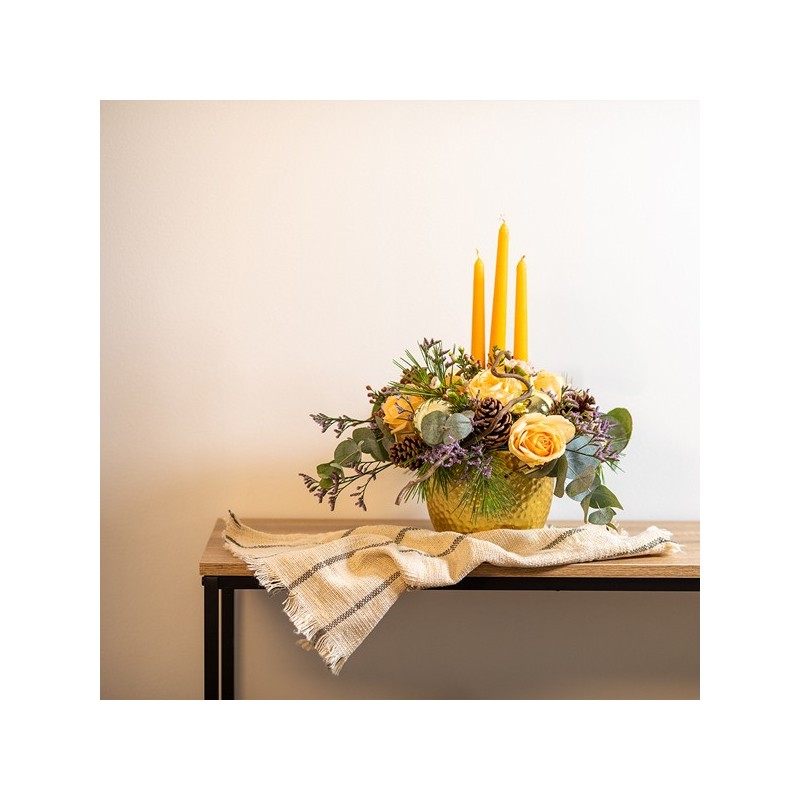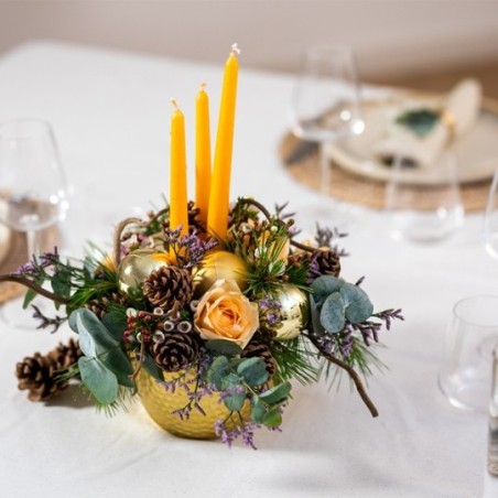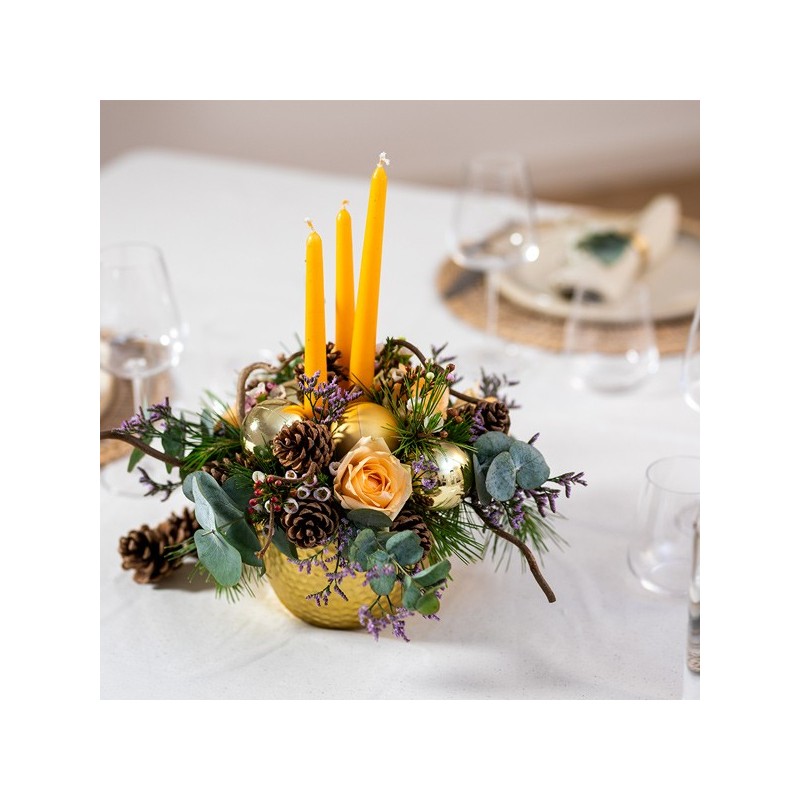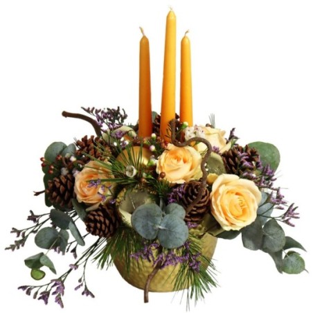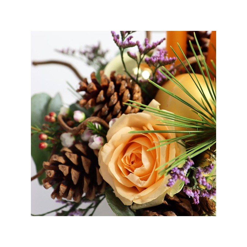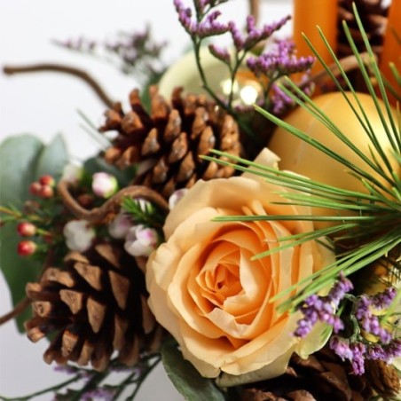 Composition de Noël dans les tons orangés composé de roses, pommes de pin, bougies, fleurettes et feuillages. Le contenant peut varier en fonction des disponibilités du fleuriste en charge de votre commande.