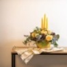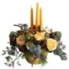 Composition de Noël dans les tons orangés composé de roses, pommes de pin, bougies, fleurettes et feuillages. Le contenant peut varier en fonction ...