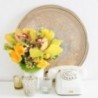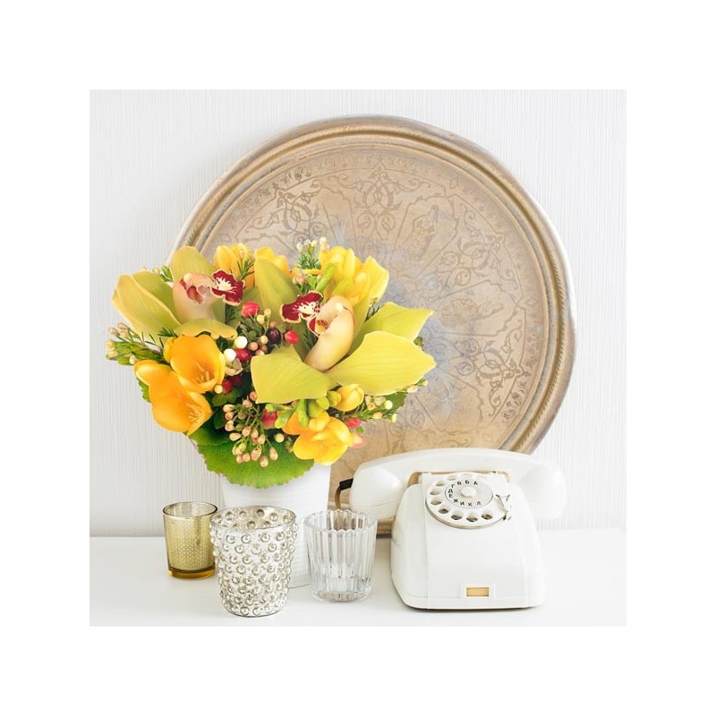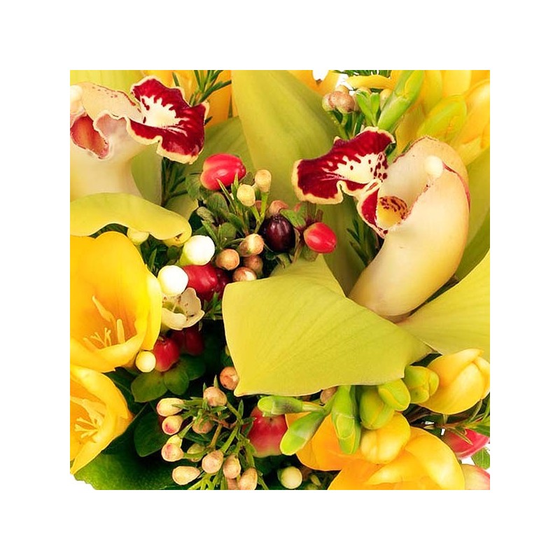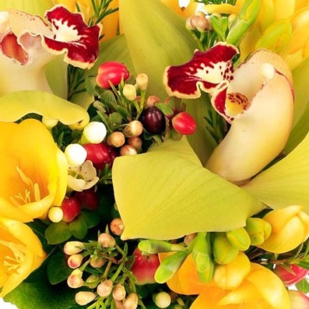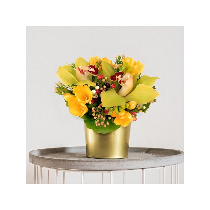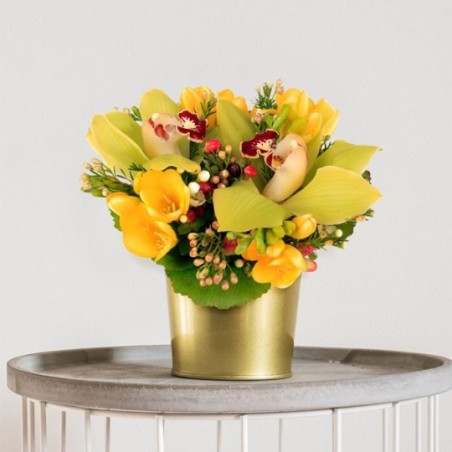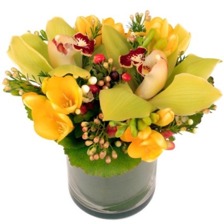 Composition piquée dans contenant avec cymbidiums verts, freesias jaunes, mousse et wax (le contenant peut varier en fonction des disponibilités chez le fleuriste).