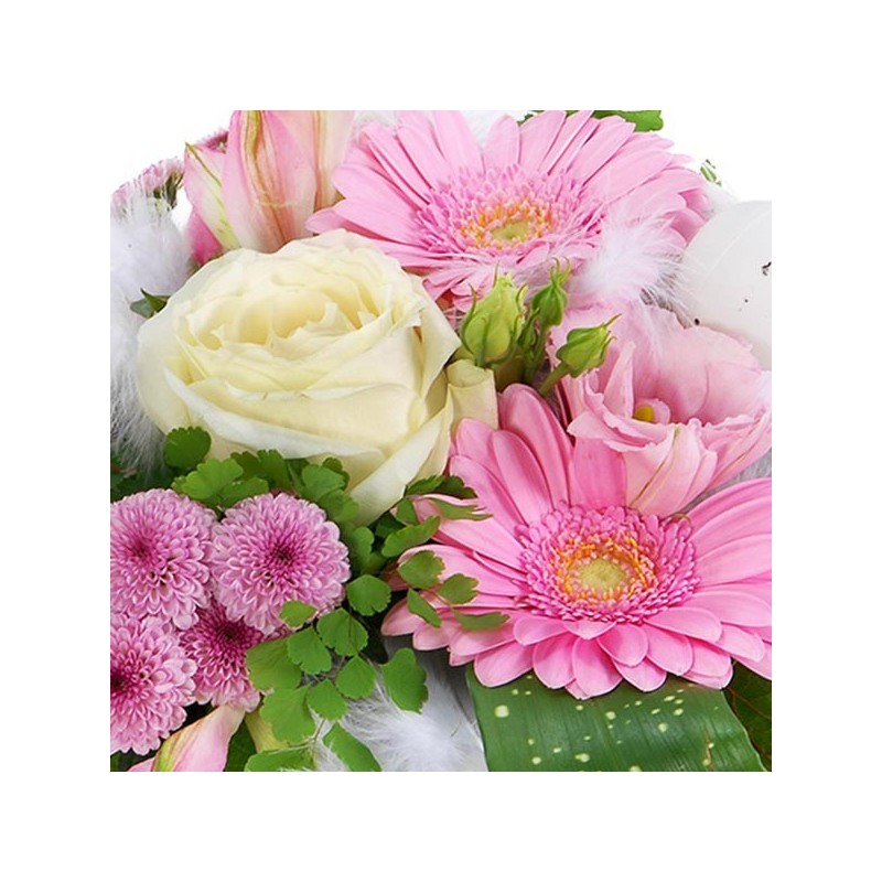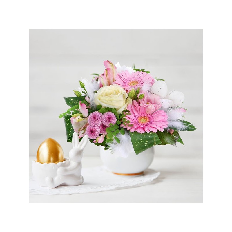 Composition piquée rose et blanche spéciale Pâques composée de germinis, alstroemerias, santinis, feuillage et décorations de Pâques. Le contenant peut varier en fonction des disponibilités chez le fleuriste.