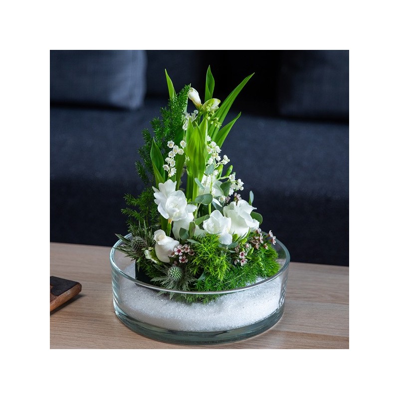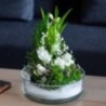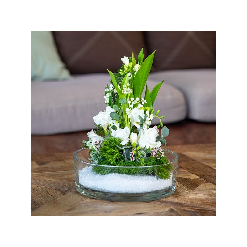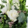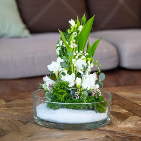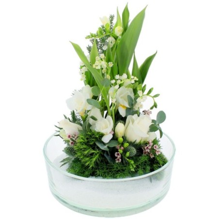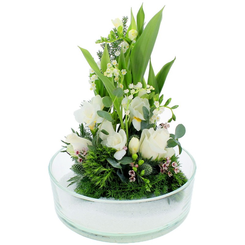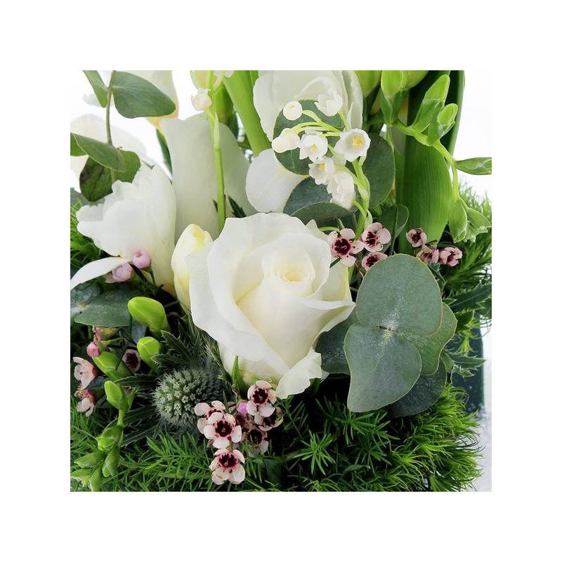 Composition piquée dans les tons blancs et verts, réalisée à partir de brins de muguets, de roses et de feuillage. Le contenant peut varier en fonction des disponibilités du fleuriste en charge de votre commande.