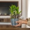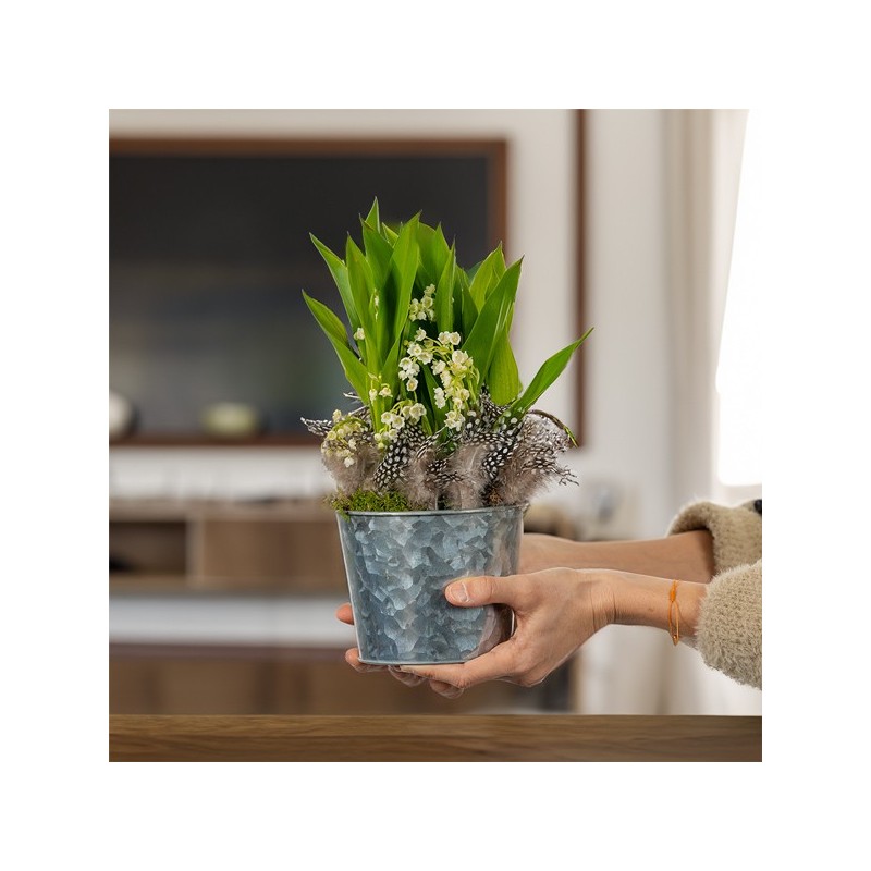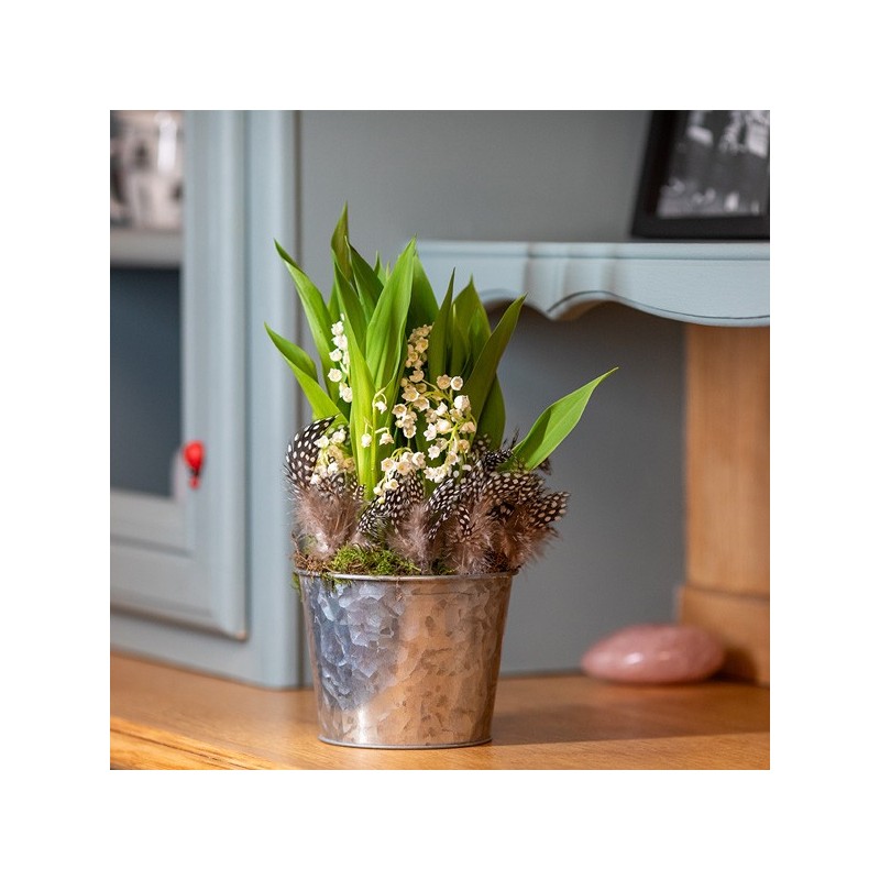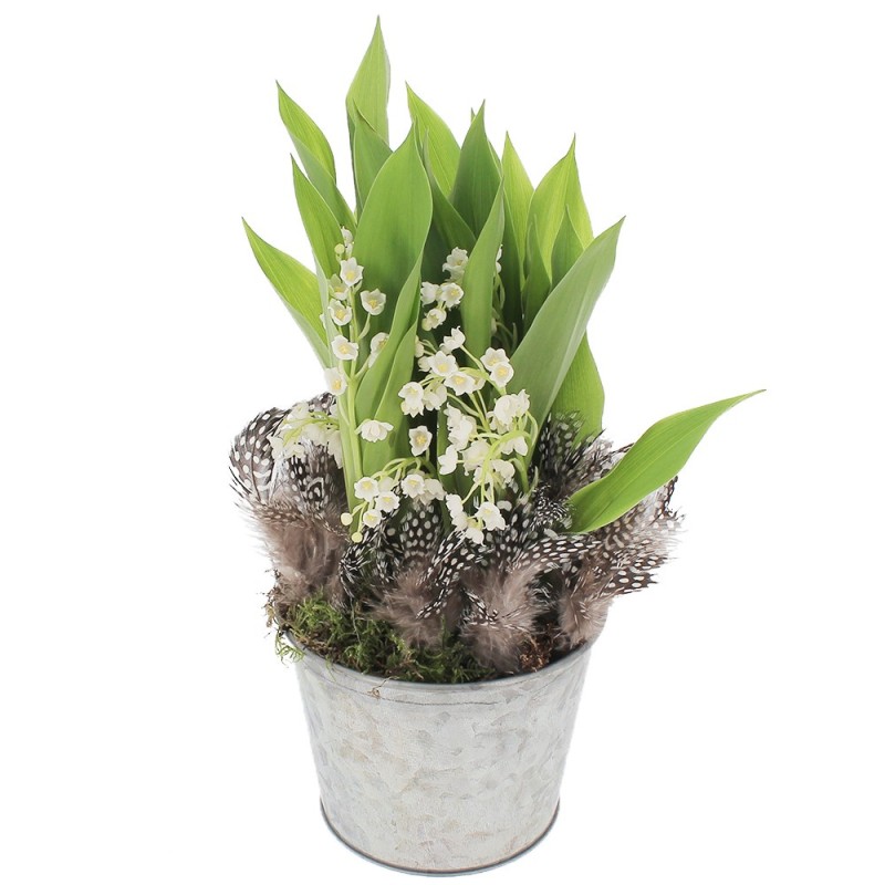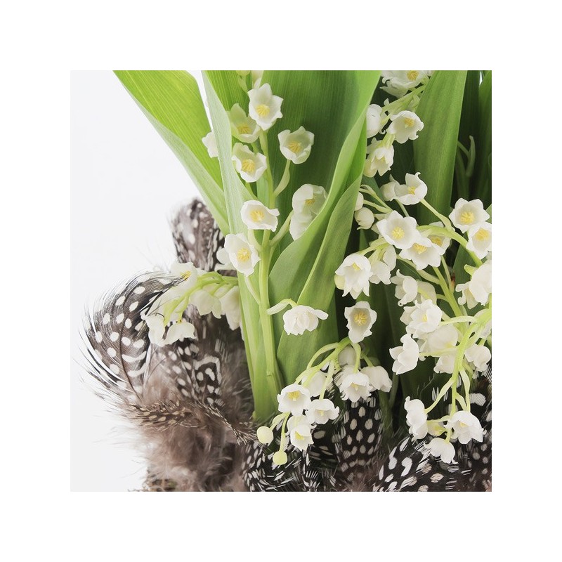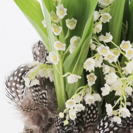 Composition de muguet accompagné d'objets décoratifs et de ses plumes décoratives. Les objets décoratifs ainsi que le contenant varient en fonction des disponibilités de votre artisan fleuriste.
